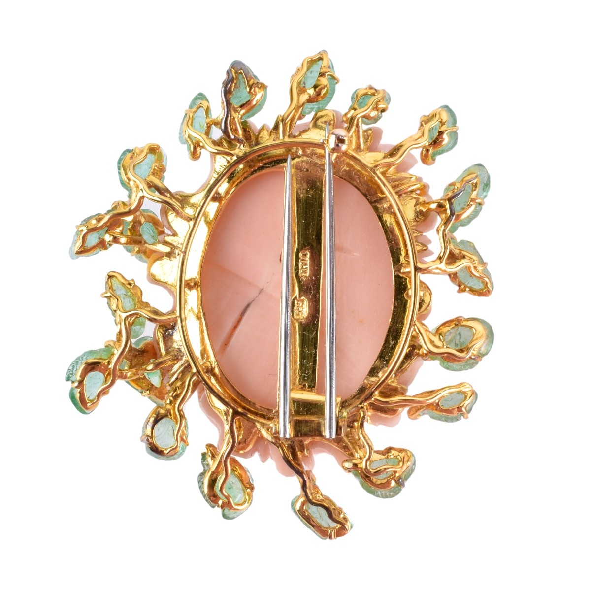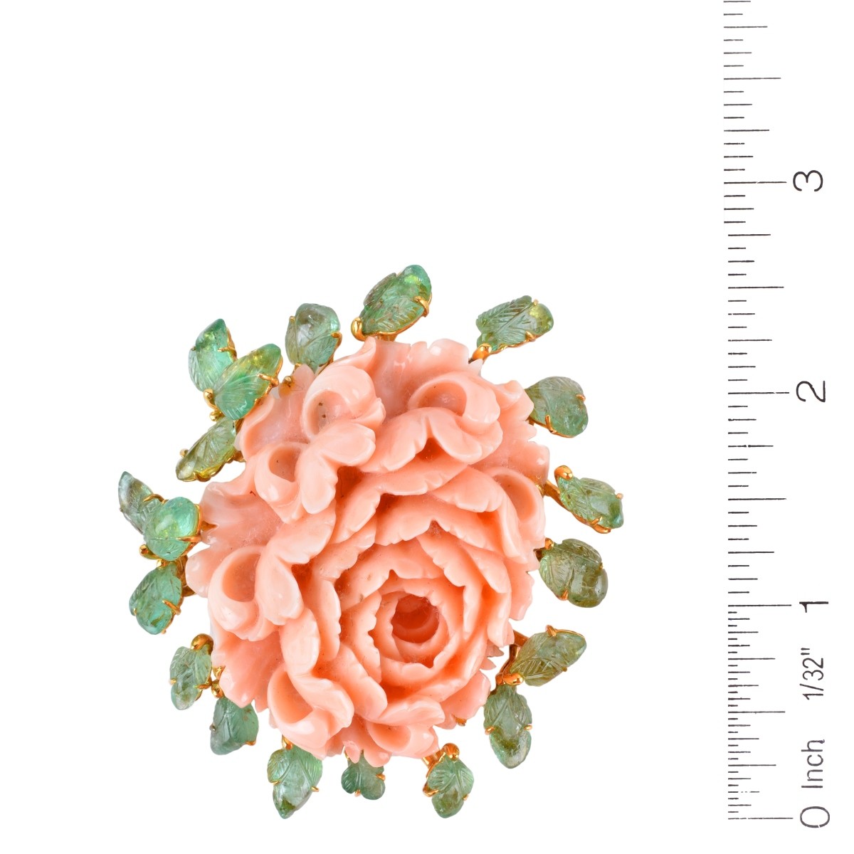 Large Vintage Carved Angel Skin Coral, Carved Emerald and 14 Karat Yellow Gold "Peony Flower" Brooch. Stamped 585, signed TRIO. Measures 2-1/4" H, 2-5/8" W. Approx. weight: 56.8 grams. Condition: Very good vintage condition. Natural fissure to back of coral. Estimate: $600.00 - $800.00 Domestic Shipping: $30.00
