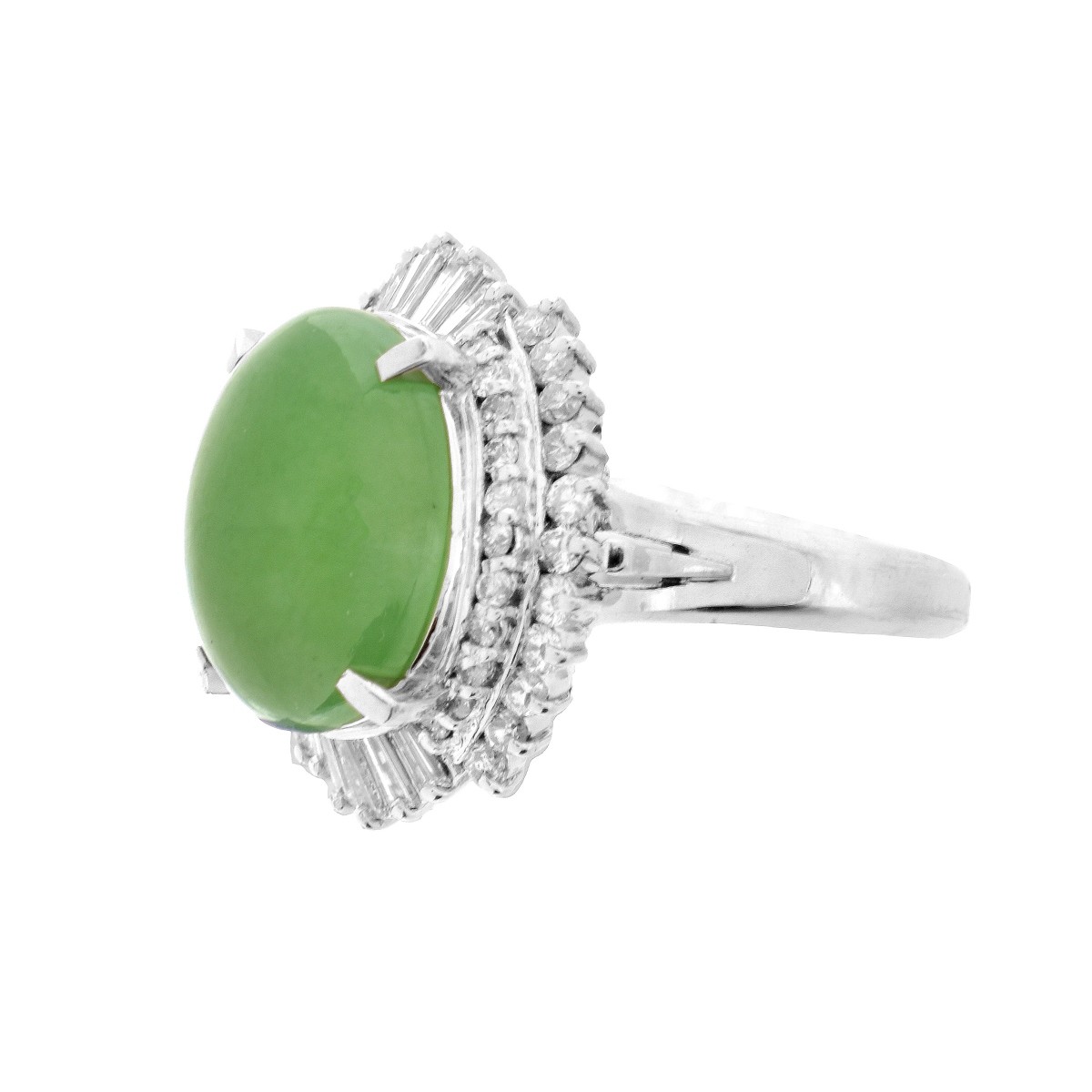 Approx. 6.55 Carat Jade Cabochon, .81 Carats TW Diamond and Platinum Ring. The diamonds of E-F color and VS1-VS2 clarity. Stamped Pt900. Ring size 5-3/4. Approx. weight 10.3 grams. Property of a former jewelry manufacturer. Condition: Good Condition Estimate: $1000.00 - $1500.00 Domestic Shipping: $30.00