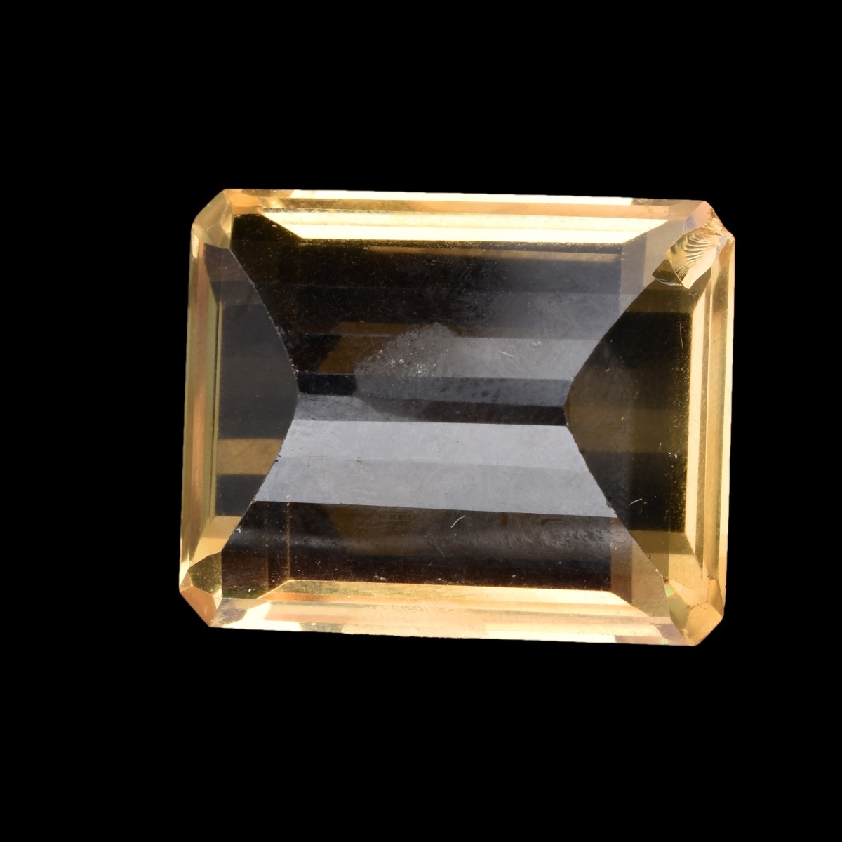 Vintage Approx. 65.0 Carat Gem Quality Emerald Cut Citrine. Measures 26.5mm x 21.5mm x 15mm. Vivid color. Approx. weight: 12.8 grams. Condition: Very good condition. Estimate: $200.00 - $300.00 Domestic Shipping: $28.00