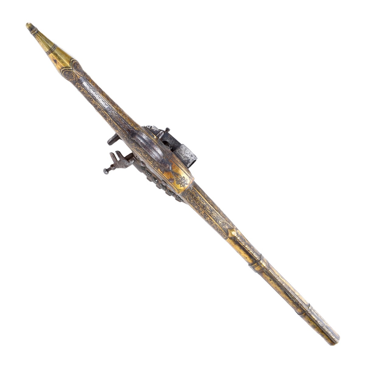 Pair of Ottoman Style Rat Tail Miquelete Lock Pistols. Ornately engraved on brass with steel miquelete lock and steel barrel. Each measures 22" L. Condition: Some corrosion from age Estimate: $50.00 - $150.00 Domestic Shipping: Third party
