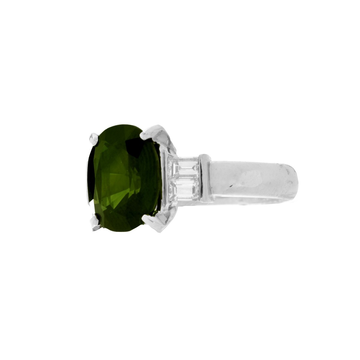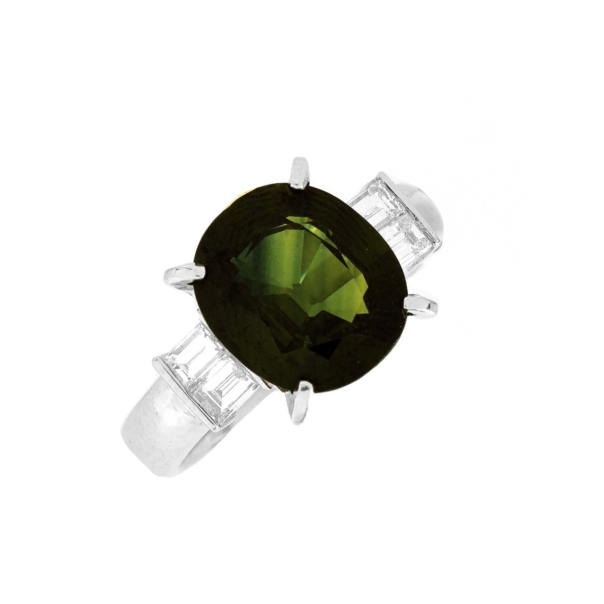 Approx. 3.80 Carat Green Sapphire, .40 Carat TW Baguette Diamond and Platinum Ring. The diamonds of D-E color and VS1-VS2 clarity. Stamped Pt900. Ring size 6. Approx. weight 7.3 grams. Property of a former jewelry manufacturer. Condition: Good Condition. Estimate: $800.00 - $1000.00 Domestic Shipping: $30.00