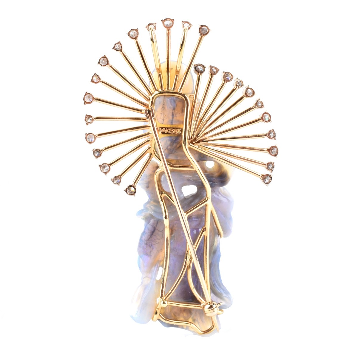 Carved Opal, Round Brilliant Cut Diamond and 14 Karat Yellow Gold Pendant / Brooch. Opal with lavender, blue and green color. Stamped 14K 585. Measures 2-7/8" H, 1-3/4" W. Condition: Very good vintage condition. Estimate: $800.00 - $1200.00 Domestic Shipping: $30.00