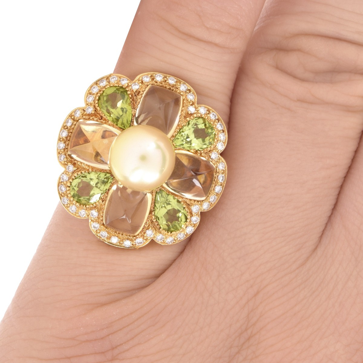 Pear, Multi Gemstone 18 Karat Yellow Gold Flower Ring. Set with a 9mm pearl and surrounded by approx. 5.89 carats TW Citrine, 2.19 Peridot and .31 carats round diamonds. Stamped 18K. Ring size 7. Approx weight 17.2 grams. Property of a former jewelry manufacturer. Condition: Good Condition. Estimate: $1200.00 - $1800.00 Domestic Shipping: $30.00