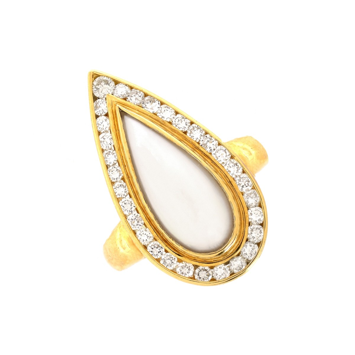 Teardrop Mother Of Pearl and Approx. 1.11 Carats TW Diamond, 18 Karat Yellow Gold Ring. The diamonds of D-E color and VS1-VS2 clarity. Stamped 18K. Ring size 11. Approx. weight 13.2 grams. Property of a former jewelry manufacturer. Condition: Very Good Condition. Estimate: $1200.00 - $1800.00 Domestic Shipping: $30.00