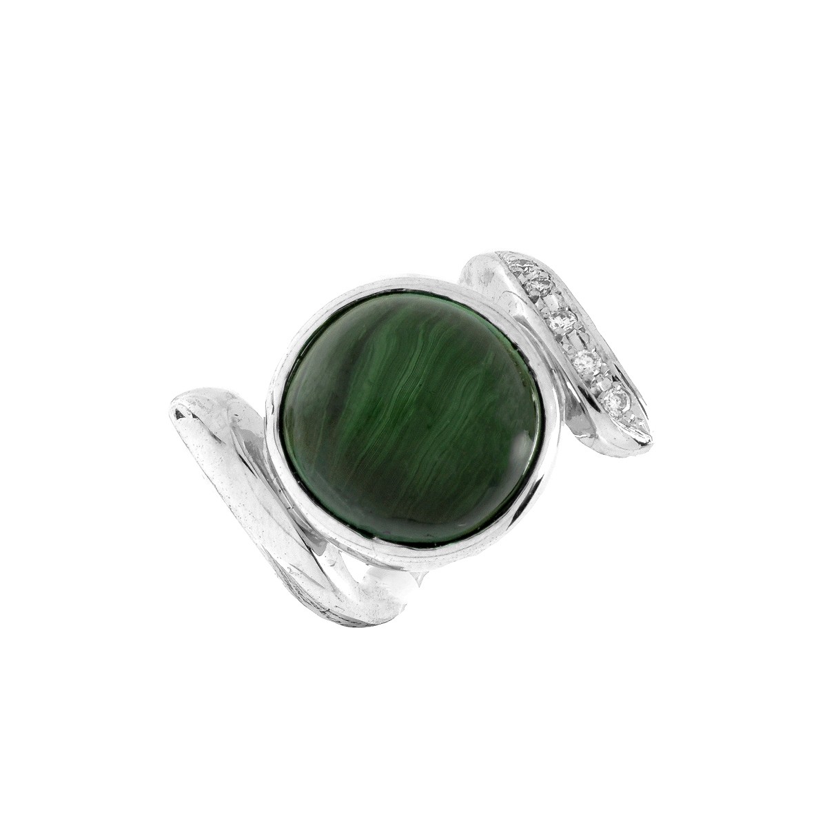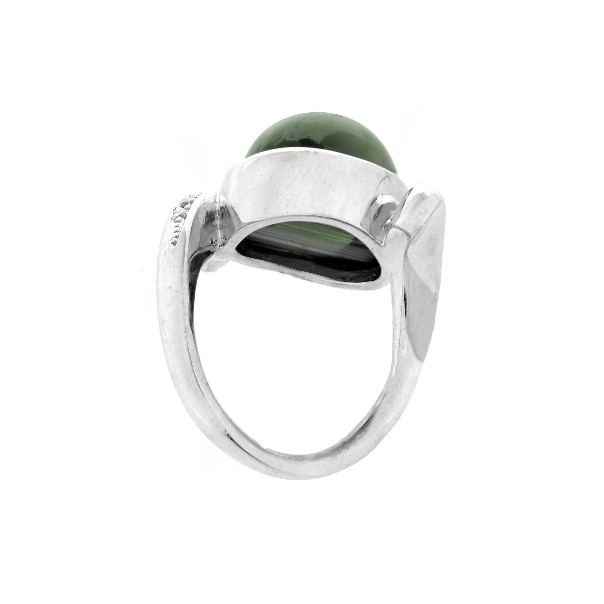 Contemporary Approx. 17.68 Green Tourmaline Cabochon, .10 Carats TW Round Diamond , 18 Karat White Gold Ring. Stamped 750. Ring Size 6-1/4. Approx. weight 16.3 grams. Property of a former jewelry manufacturer. Condition: Very Good Condition. Estimate: $1600.00 - $2000.00 Domestic Shipping: $30.00