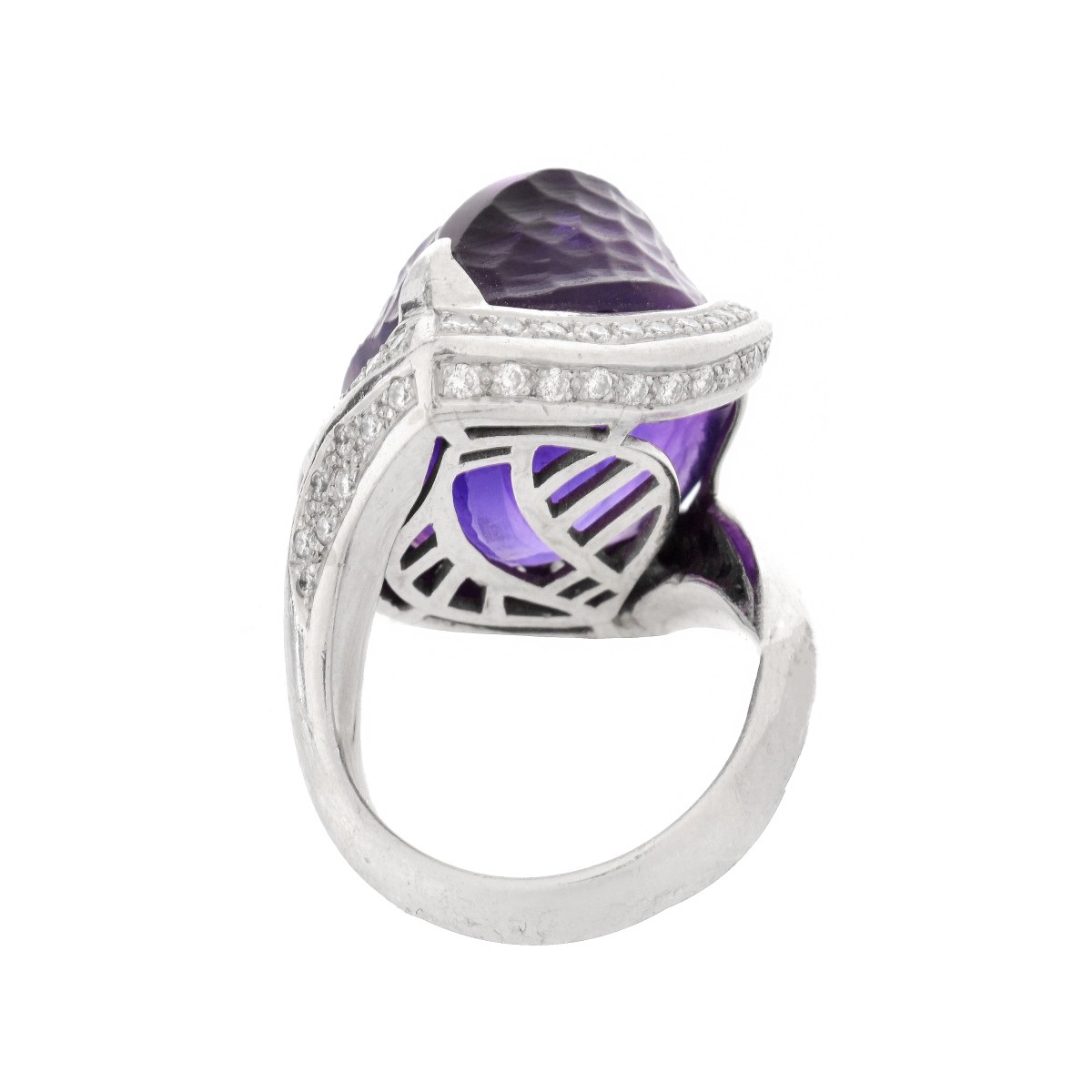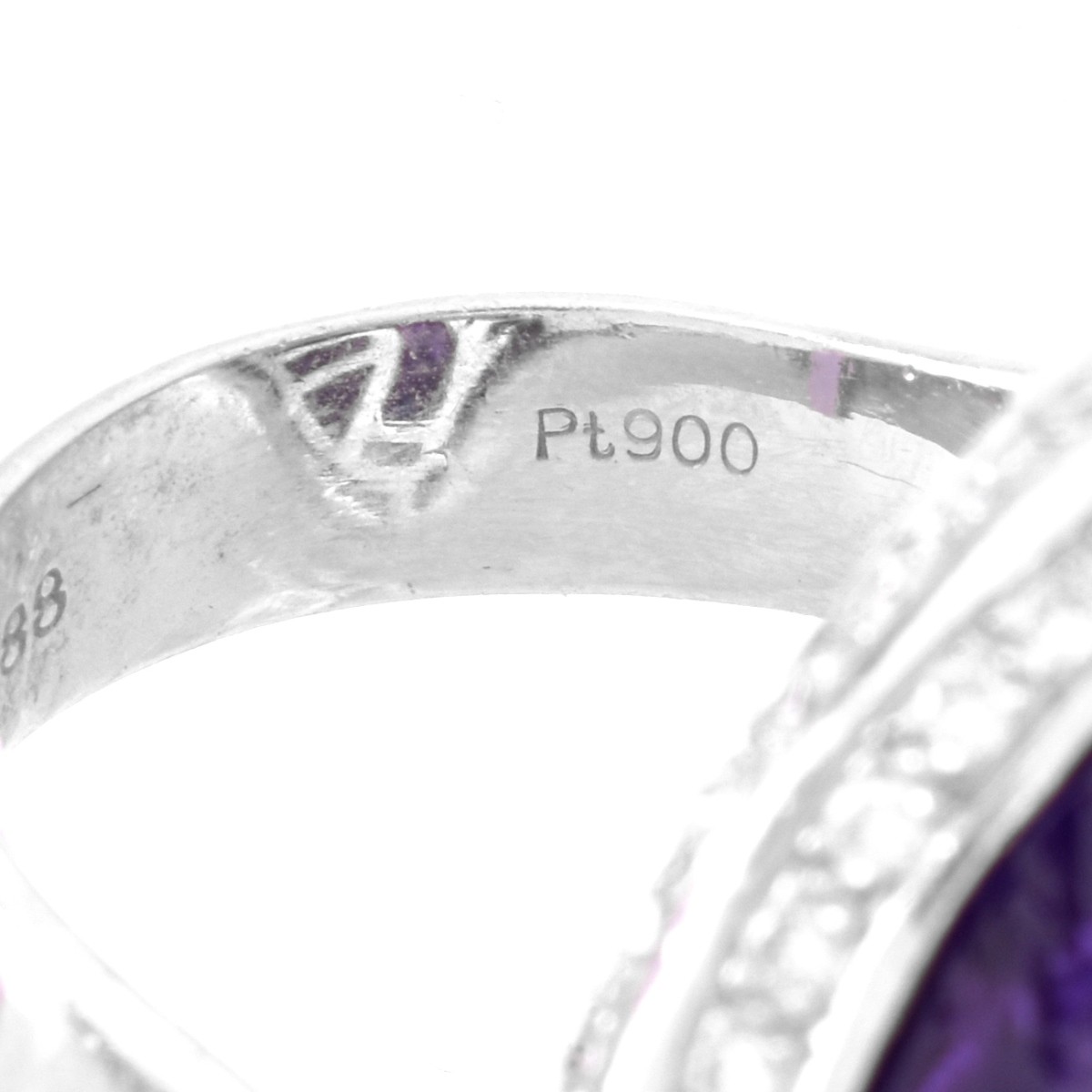 Modern Approx. 30.70 Carat Carved Amethyst, .88 Carat TW Diamond and Platinum Ring. The gem quality Amethyst with vivid color, the diamonds of F-G color and VS1-SI1 clarity. Stamped Pt900. Ring size 6-3/4. Approx. weight 26.2 grams. Property of a former jewelry manufacturer. Condition: Good Condition. Estimate: $1500.00 - $2000.00 Domestic Shipping: $30.00