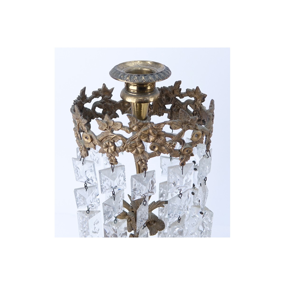 Antique Gilt Brass and Hanging Crystal Three Arm Figural Lamp with Candlesticks Set. Nicks to bases, small chips to crystals, two missing crystals, rubbing to gilt. Candelabrum measures 19-1/4" H x 16-1/2" W, candlesticks measures 16-5/8" H, (estimate $250-$350) Shipping: Third party.