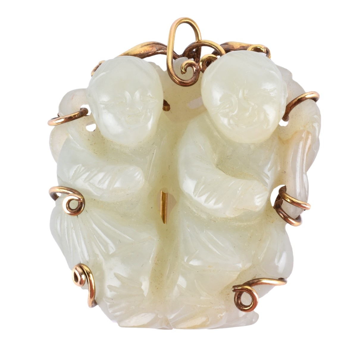 Mid 20th Century Carved Celadon Jade and 14 Karat Yellow Gold "Two Boy" Pendant Brooch. Stamped 14K. Measures 2-1/8" H, 1-7/8" W. Approx. weight: 53.8 grams. Condition: Very good condition. Estimate: $300.00 - $500.00 Domestic Shipping: $30.00
