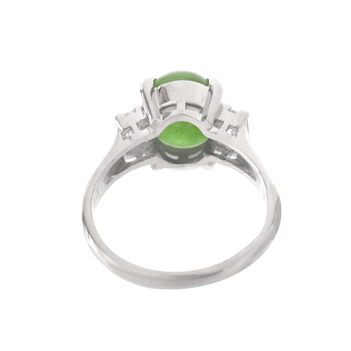 Approx. 3.71 Carat Fine Apple Green Cabochon Jade, .49 Carats TW Emerald Cut Diamond and Platinum Ring. The diamonds of D-E color and VS1-VS2 clarity. Stamped Pt900. Ring size 7-1/2. Approx. weight 7.7 grams. Property of a former jewelry manufacturer. Condition: Very Good Condition Estimate: $1200.00 - $1600.00 Domestic Shipping: $30.00
