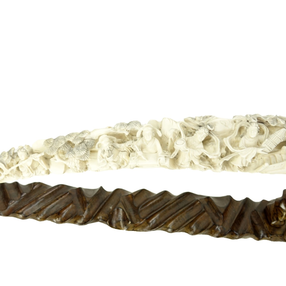 Large 19th Century Chinese Deep Relief Carved Ivory Tusk/Bridge Mounted on Wooden Base. Signed. Decorated with several important figures and pagoda motif. Measures 32" L, base measures 5-1/2" H x 33-1/2" L. We Will Not Ship This Item Out of State of Florida. Anyone Having This Item Shipped Must Have a Florida Address or the Item will not be Shipped. We will Not Knowingly Sell Endangered Species outside of Legal Channels. Condition: Good condition Estimate: $2000.00 - $3000.00 Domestic Shipping: Third party