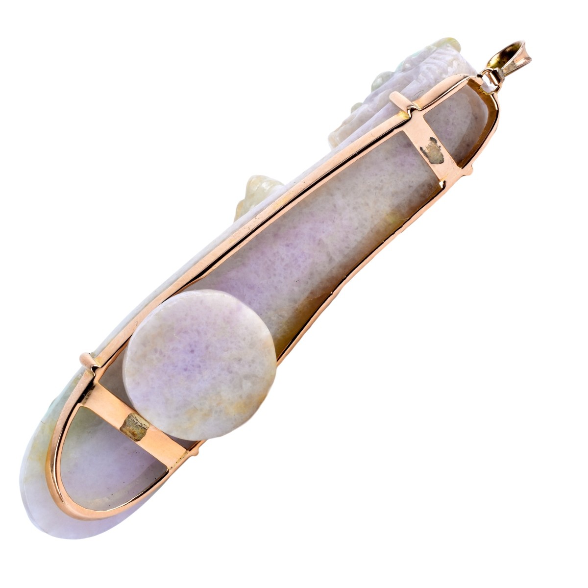 Early to Mid 20th Century Chinese Carved Lavender to Celadon Jade Belt Buckle and 14 Karat Yellow Gold Pendant. Stamped Chinese hallmarks. Measures 3-3/8" L, 5/8" W. Approx. weight: 50.4 grams. Condition: Very good condition. Estimate: $200.00 - $400.00 Domestic Shipping: $30.00