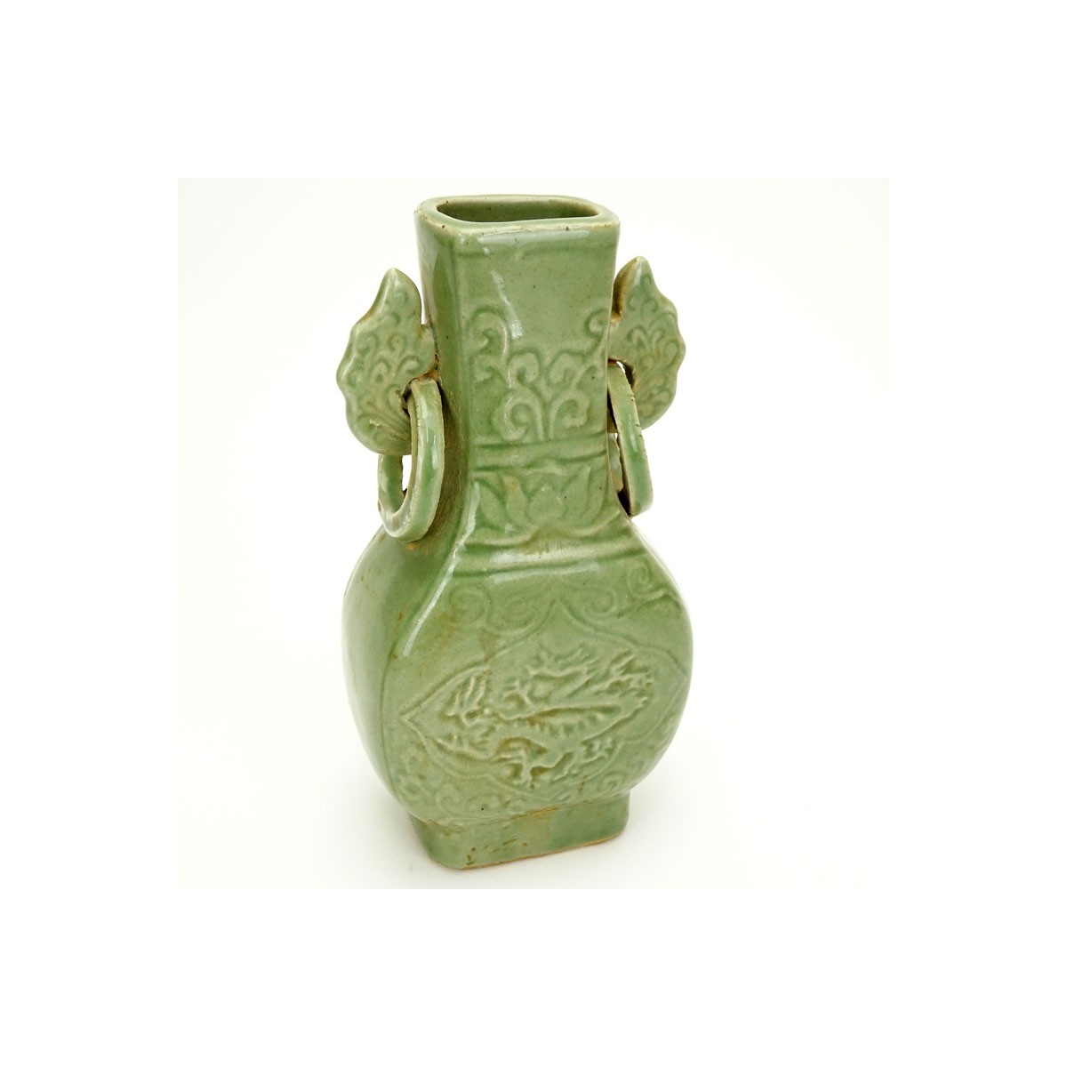 Chinese Yuan Dynasty Celadon Glazed and Incised Ring Handled Vase. Unsigned. Measures 8" H. Condition: Good condition. Estimate: $600.00 - $800.00 Domestic Shipping: $48.00