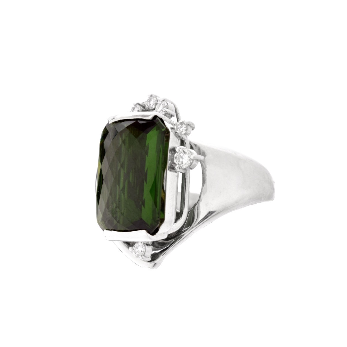 Approx. 11.82 Carat Rectangular Green Tourmaline, .28 Carats TW Round Diamond and Platinum Ring. Stamped Pt900. Ring size 6-1/2. Approx. weight 26 grams. Property of a former jewelry manufacturer. Condition: Very Good Condition. Estimate: $1800.00 - $2400.00 Domestic Shipping: $30.00