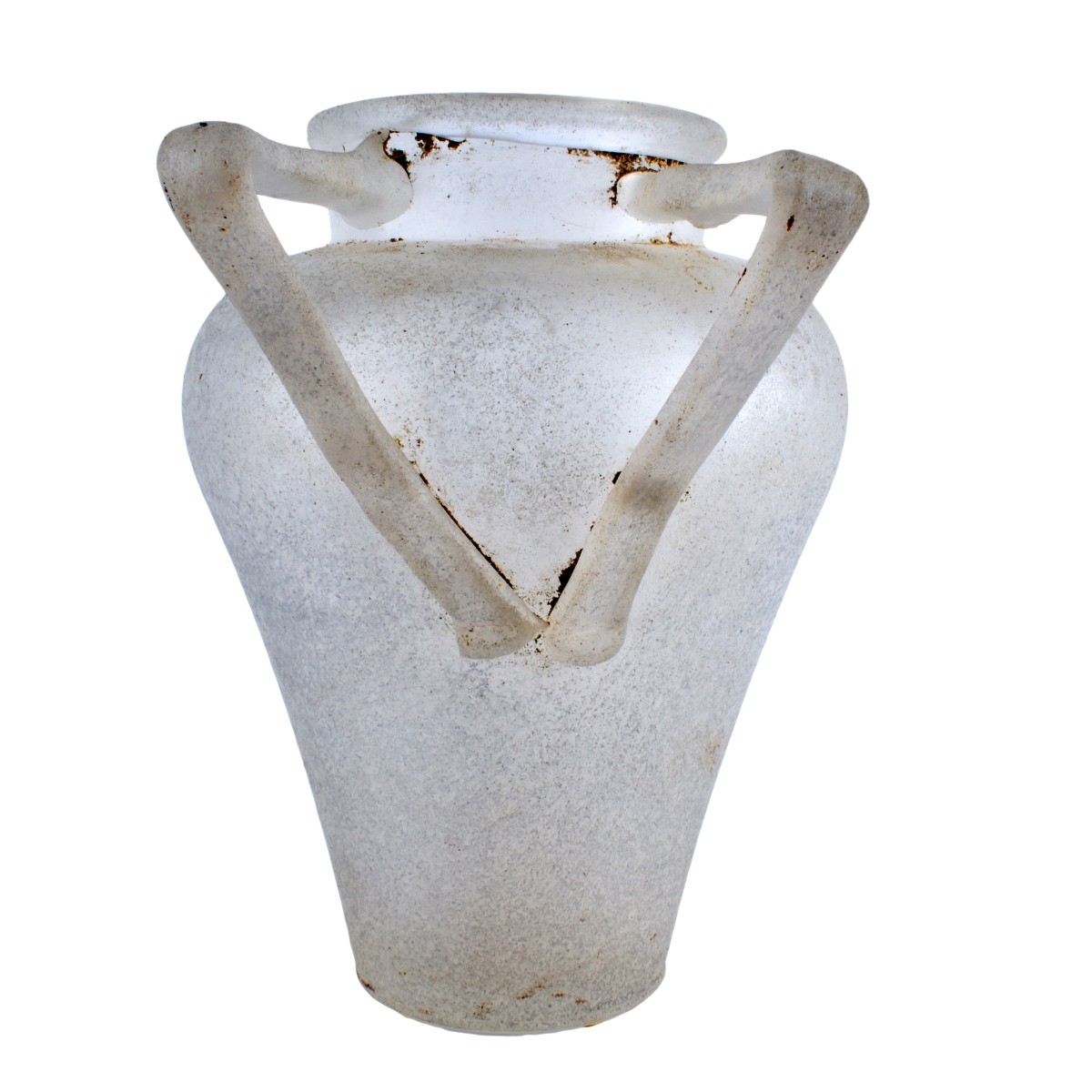 Impressive Large Seguso Vetri d'Arte 'a Scavo' Murano Glass Amphora Handled Vase. Well made with the use of the 'Scavo' technique to replicate to look and feel of ancient Roman archeological glass. Unsigned. Measures 10-5/8" H x 10" W. Condition: Good condition. Estimate: $400.00 - $600.00 Domestic Shipping: Third party