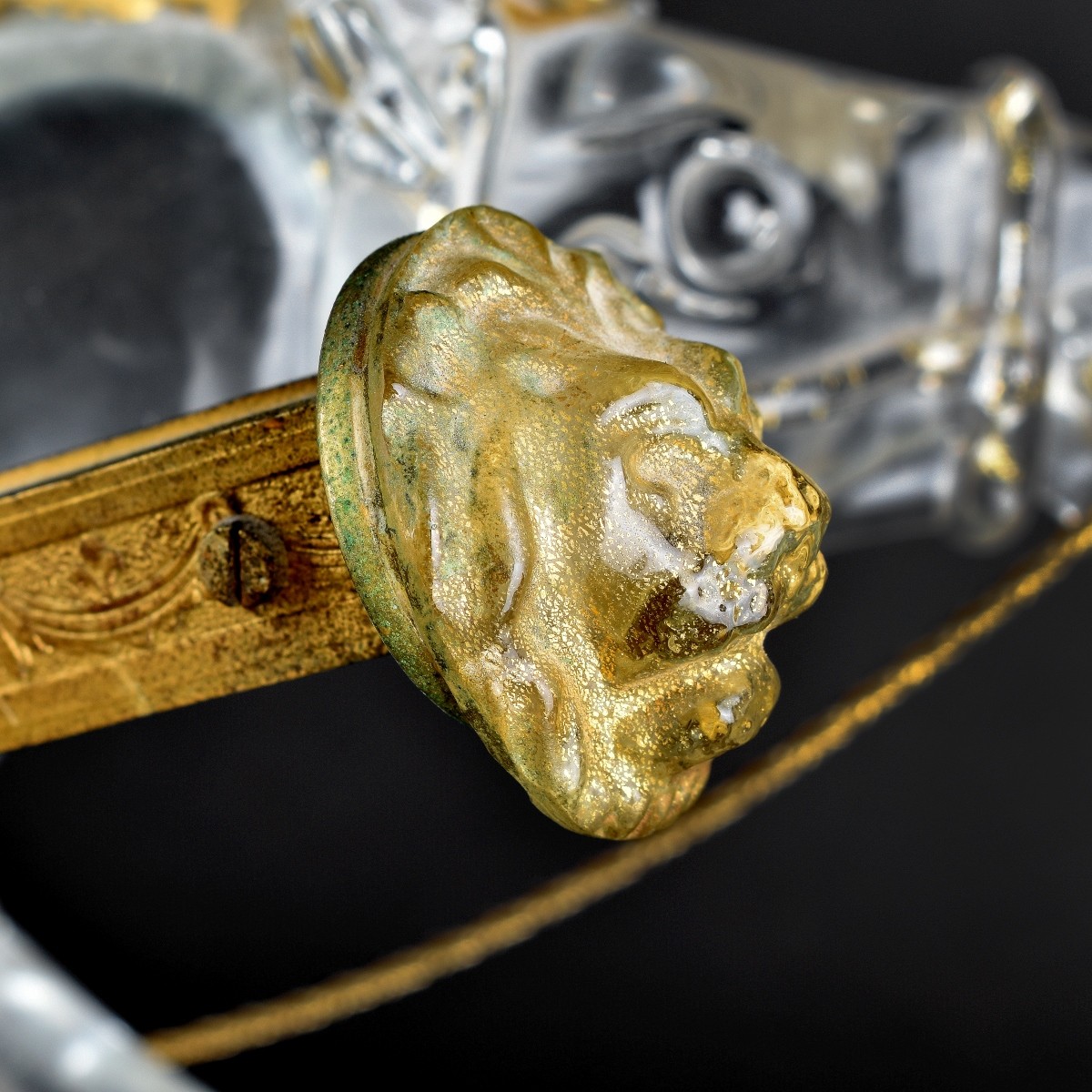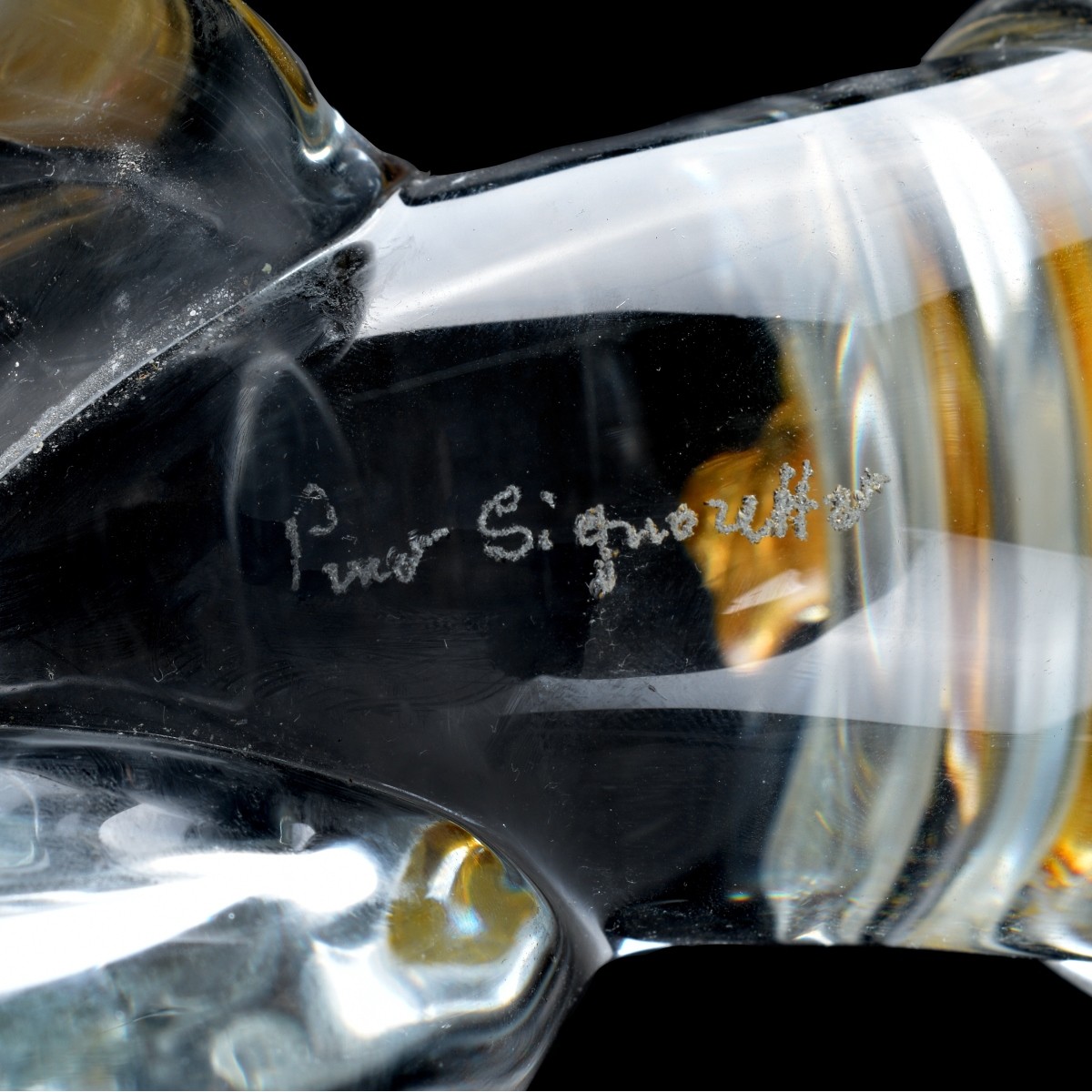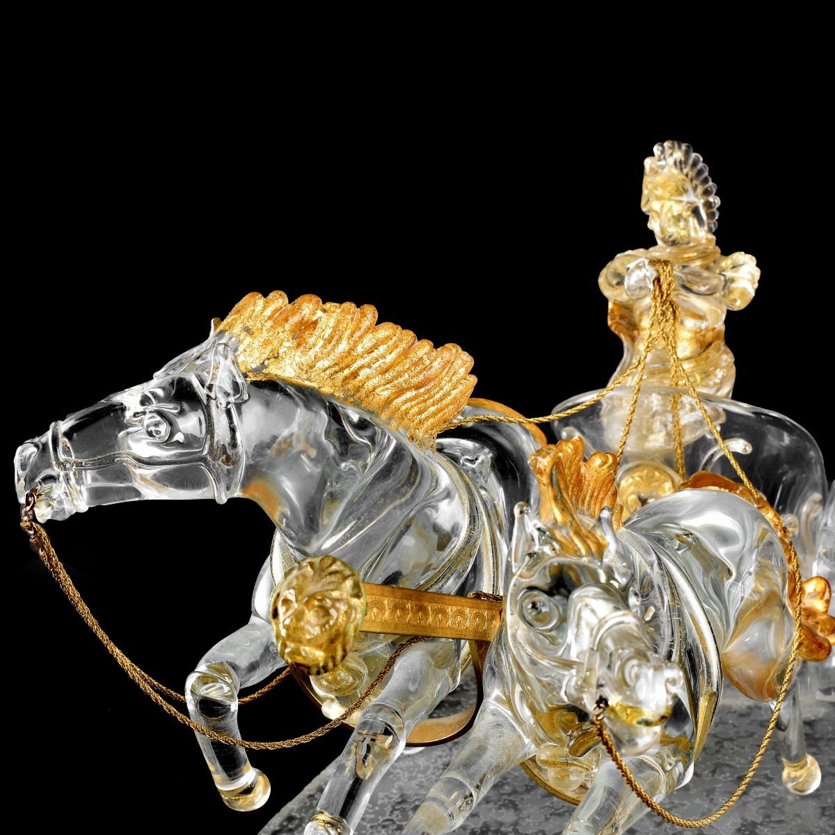 Pino Signoretto, Italy (born 1944) Seguso Murano Hand Blown Art Glass Chariot Sculpture with Gold Flecks. Signed "Pino Signoretto" on the bottom of the stallion and chariot. Classic subject comprised of chariot rider with two stallions. Measures 14" H x 23" L x 13-1/2" D. Condition: Normal rubbing to gilding overall good condition Estimate: $5000.00 - $7000.00 Domestic Shipping: Third party