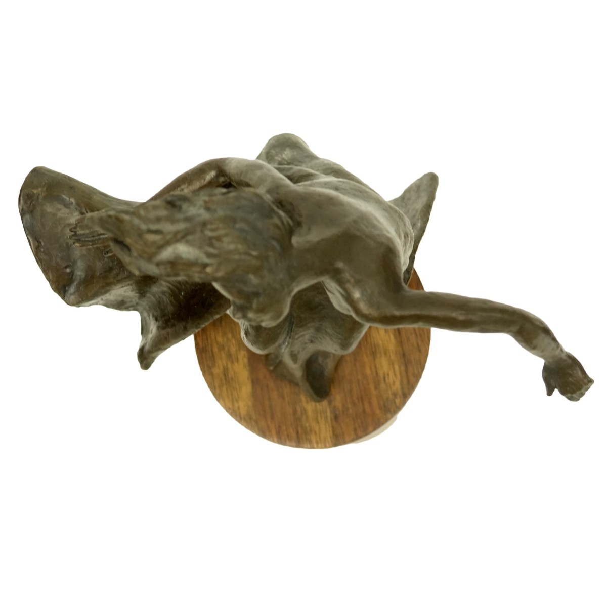 Renzullo, American (20th Century) Bronze Sculpture Mounted on Wooden Base "Dancing Beauty" Signed and Numbered 1/20 on Obverse Side. Sculpture Measures 7-3/4" H x 8" W, base measures 6-5/8" H x 3-3/4" W. Condition: Good condition Estimate: $150.00 - $250.00 Domestic Shipping: $78.00