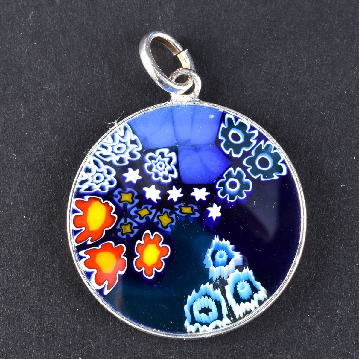 8 Murano Piu millefiori glass and sterling pendants. In box. Stamped 925. Measures 1" dia., 5/8" dia. Also a Mallorca double strand gray pearl bracelet. Pearls measure 6mm and 9" L. Condition: Good condition. Estimate: $50.00 - $100.00 Domestic Shipping: $30.00