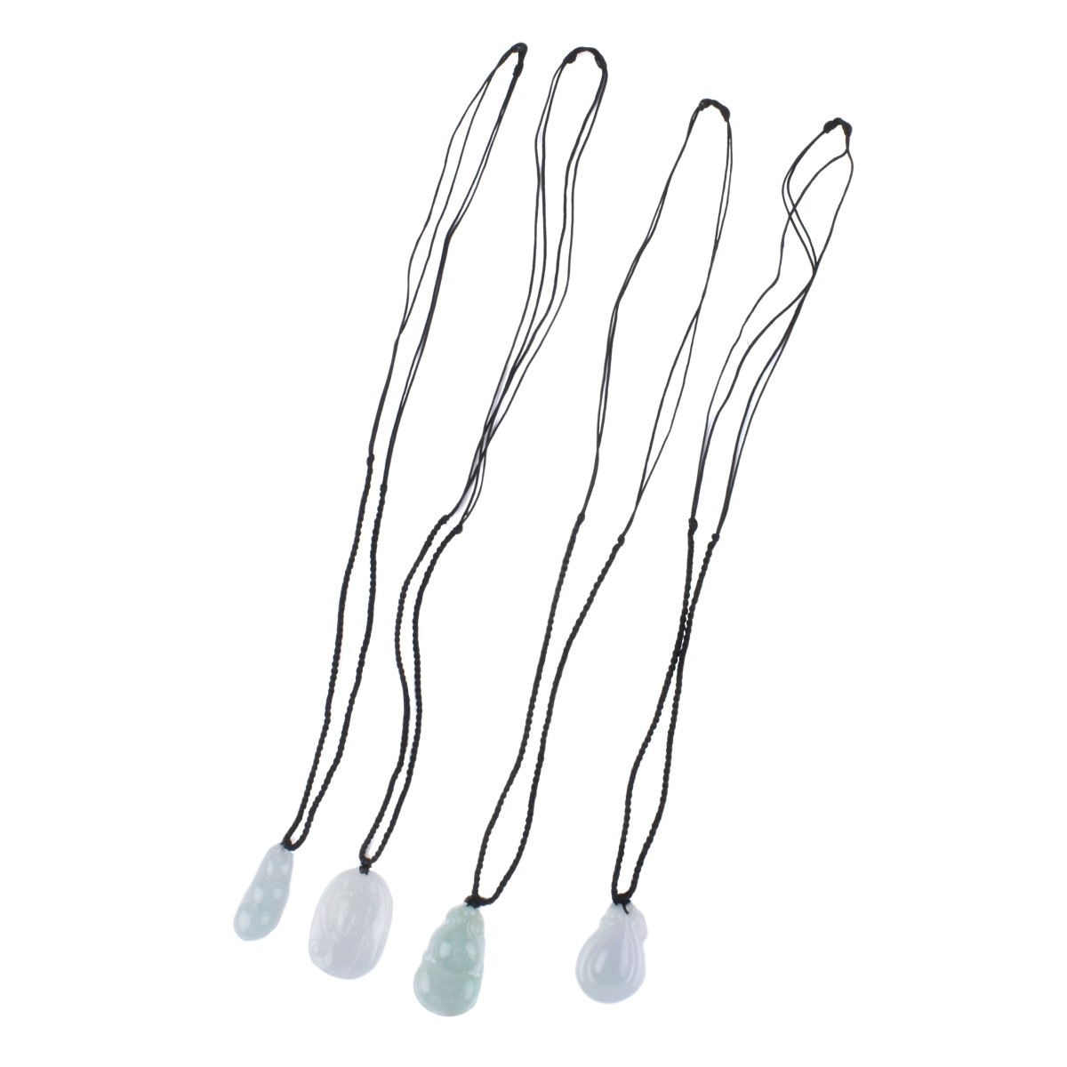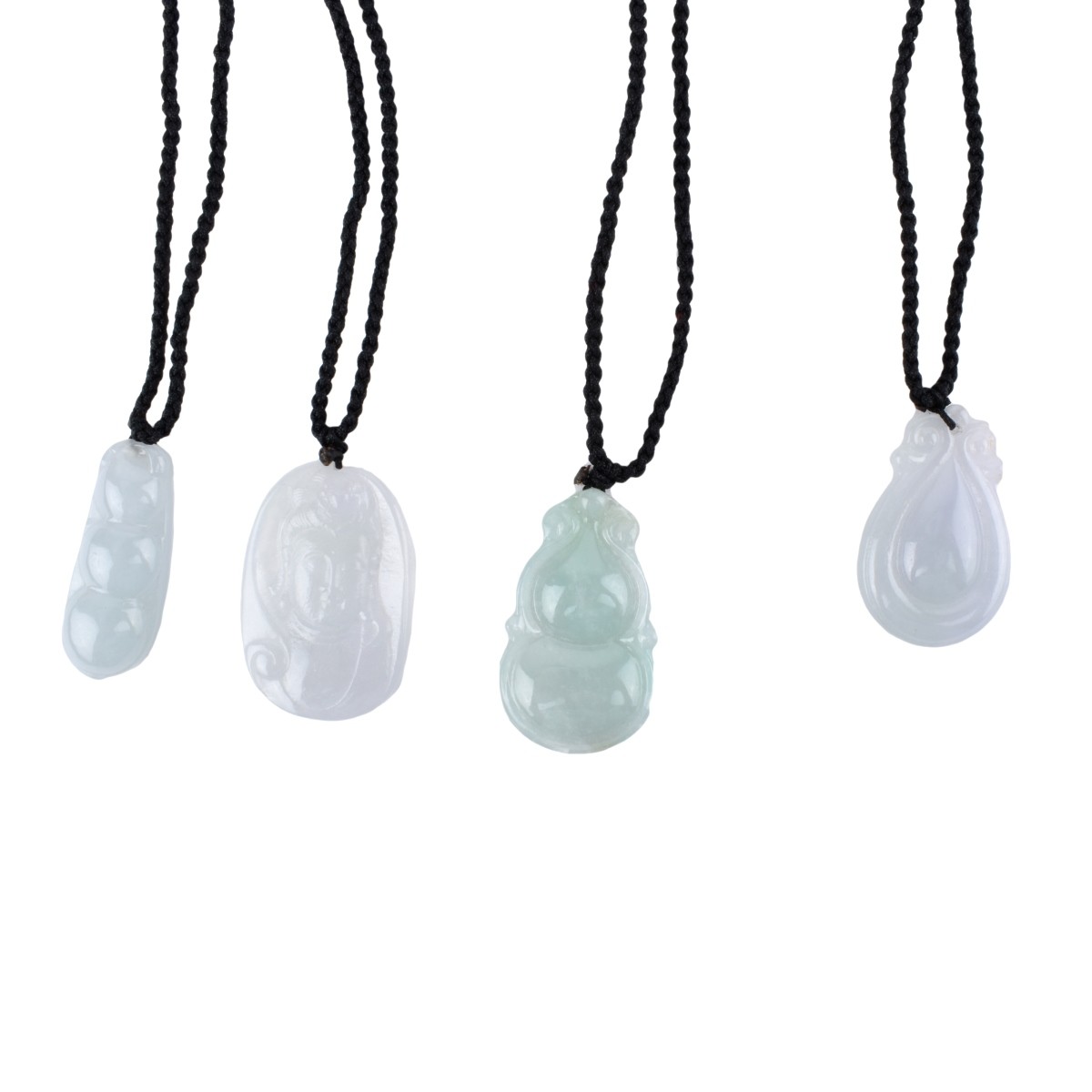 Four Chinese Carved Celadon Jade Pendant Necklaces. Ranging in size from 1-1/2" L to 1-1/4" L. 13-1/2" Drop. Approx. Total Weight 40 grams. All weights are approx. Unsigned. Condition: Very good condition. Estimate: $50.00 - $150.00 Domestic Shipping: $30.00