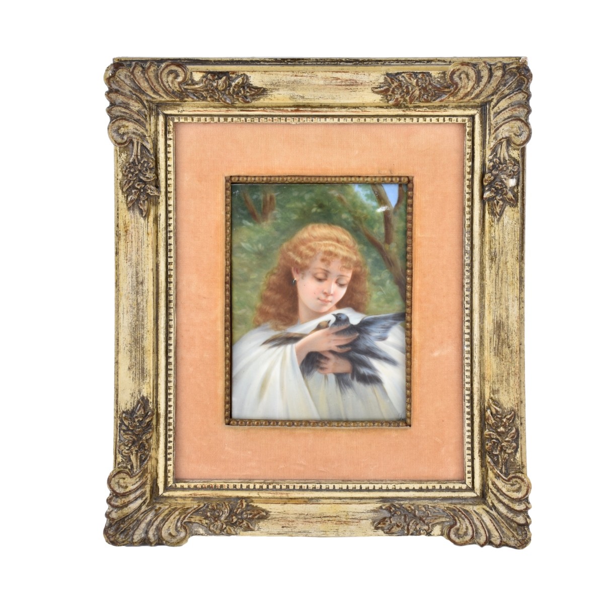 20th Century KPM Style Porcelain Plaque Mounted in Frame, Young Girl Holding Birds, Signed Lower Right. Sight measures 5-3/4" H x 4" W, frame measures 11-1/2" H x 9-1/2" W. Condition: Good condition Estimate: $100.00 - $150.00 Domestic Shipping: $78.00