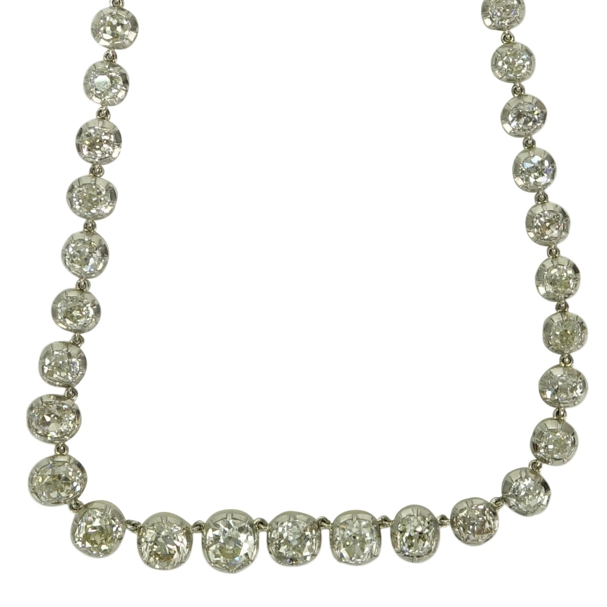 Approx. 35.53 Carat TW Antique European/Mine Cut Diamond, 18 Karat Gold and Platinum Graduated Necklace. The diamonds range from H-K color and VS1-SI1 with a few SI2's clarity. Measures 17" L. Approx. weight 75.0 grams. Condition: Very Good condition. Estimate: $60000.00 - $80000.00 Domestic Shipping: $32.00