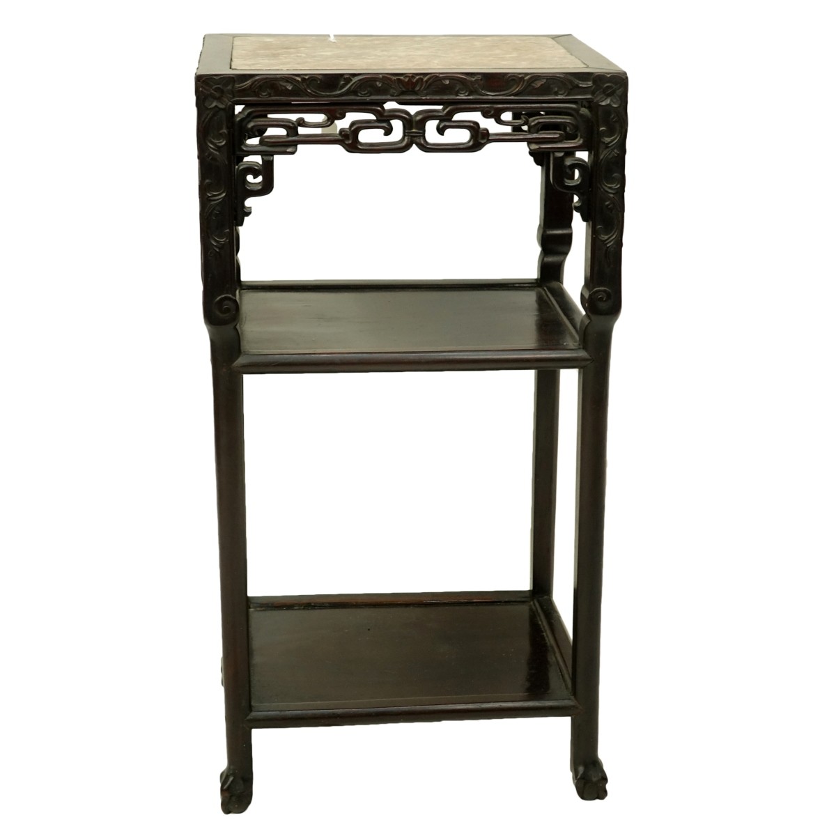 19/20th Century Chinese Carved Wood Marble Top Two Tiered Pedestal. Pierced and carved apron. Measures 31-3/4" H x 16-1/2" W x 12-1/2" D. Condition: Small nicks to marble top, some scratches and nicks to wood Estimate: $150.00 - $250.00 Domestic Shipping: Third party