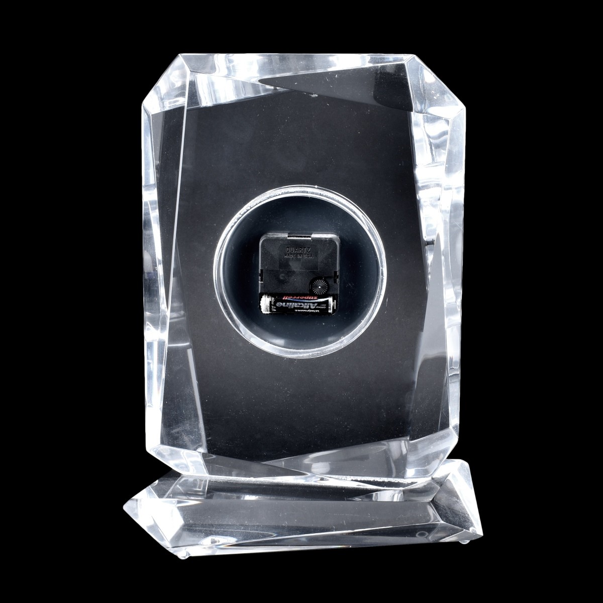 Large Mid Century Modern Faceted Lucite Clock. Unsigned. Measures 13-3/4" H x 10" W. The gallery does not warranty the running condition of clocks. Condition: Structurally in good condition Estimate: $50.00 - $100.00 Domestic Shipping: $88.00