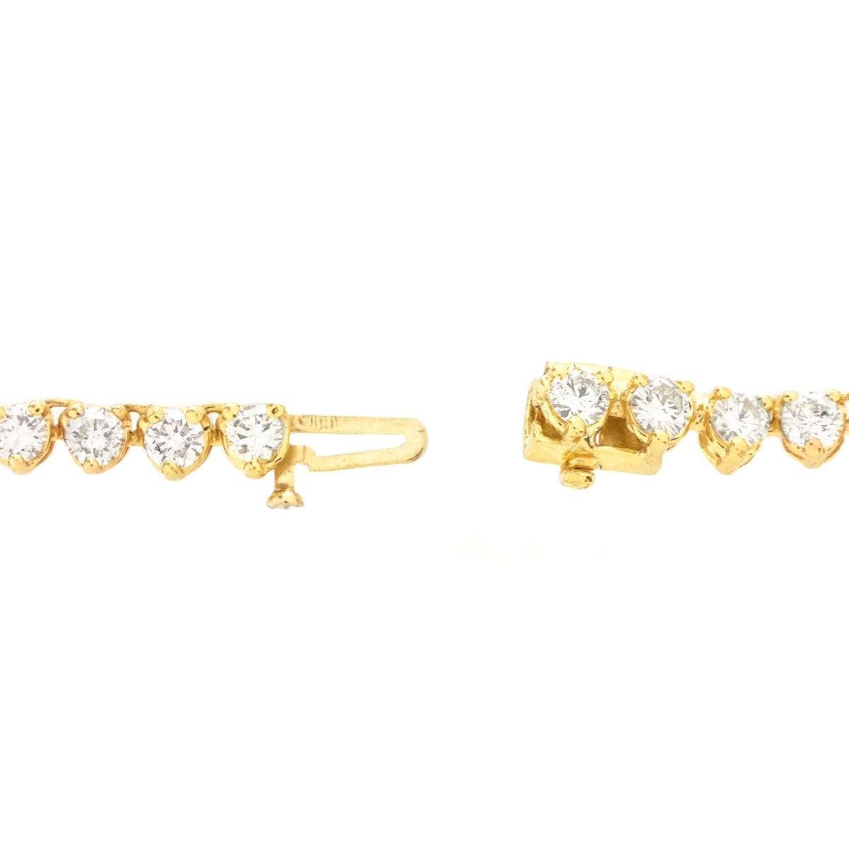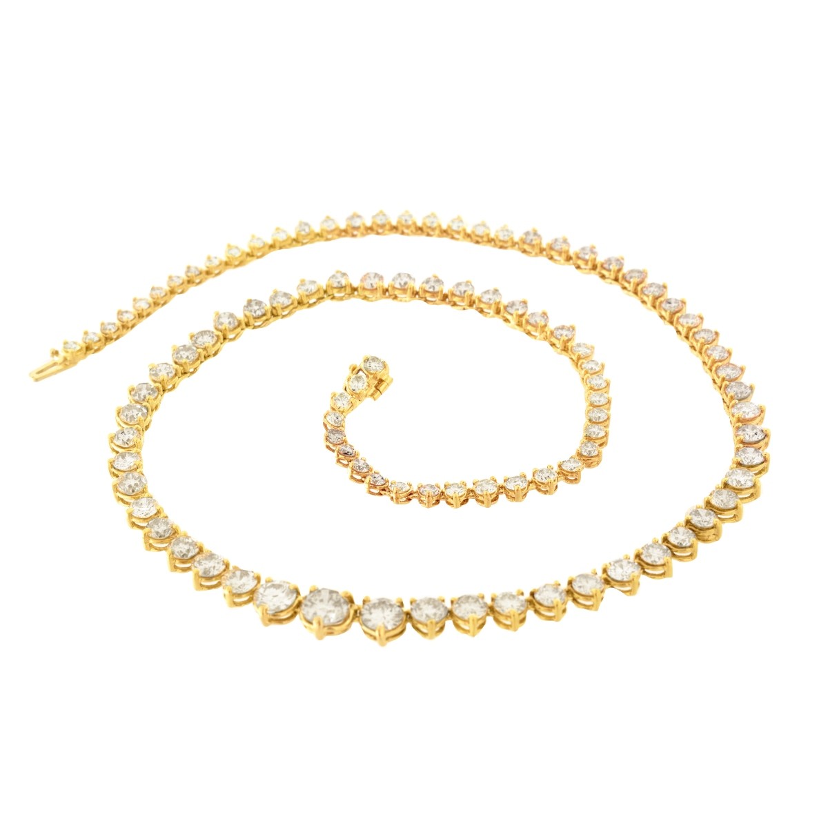Vintage Approx. 24.75 Carat TW Ninety Eight Graduated Round Brilliant Cut Diamond and 18 Karat Yellow Gold Riviera Necklace. Set in the center with an approx. 1.27 carat diamond and flanked on with side with a .70 carat. Diamonds H-I-J color, VS1-SI2 clarity. Stamped 18K. measures 18: L. Approx. weight: Condition: Very good condition. Estimate: $15000.00 - $20000.00 Domestic Shipping: $30.00