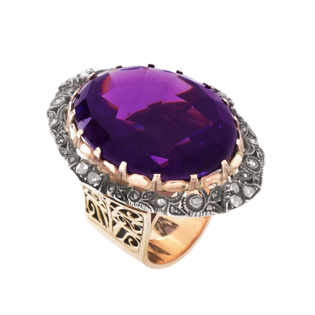 Retro Large Gem Quality Amethyst, Approx. 1.0 Carat TW Rose Cut Diamond and 14 Karat Yellow and White Gold Ring. Amethyst measures 37.5 x 28.0 x 16.0mm, with vivid color.. Ring size 8. Approx. weight: 64.0 grams. Condition: Slight abrasions to amethyst otherwise good vintage condition. Estimate: $3000.00 - $5000.00 Domestic Shipping: $30.00