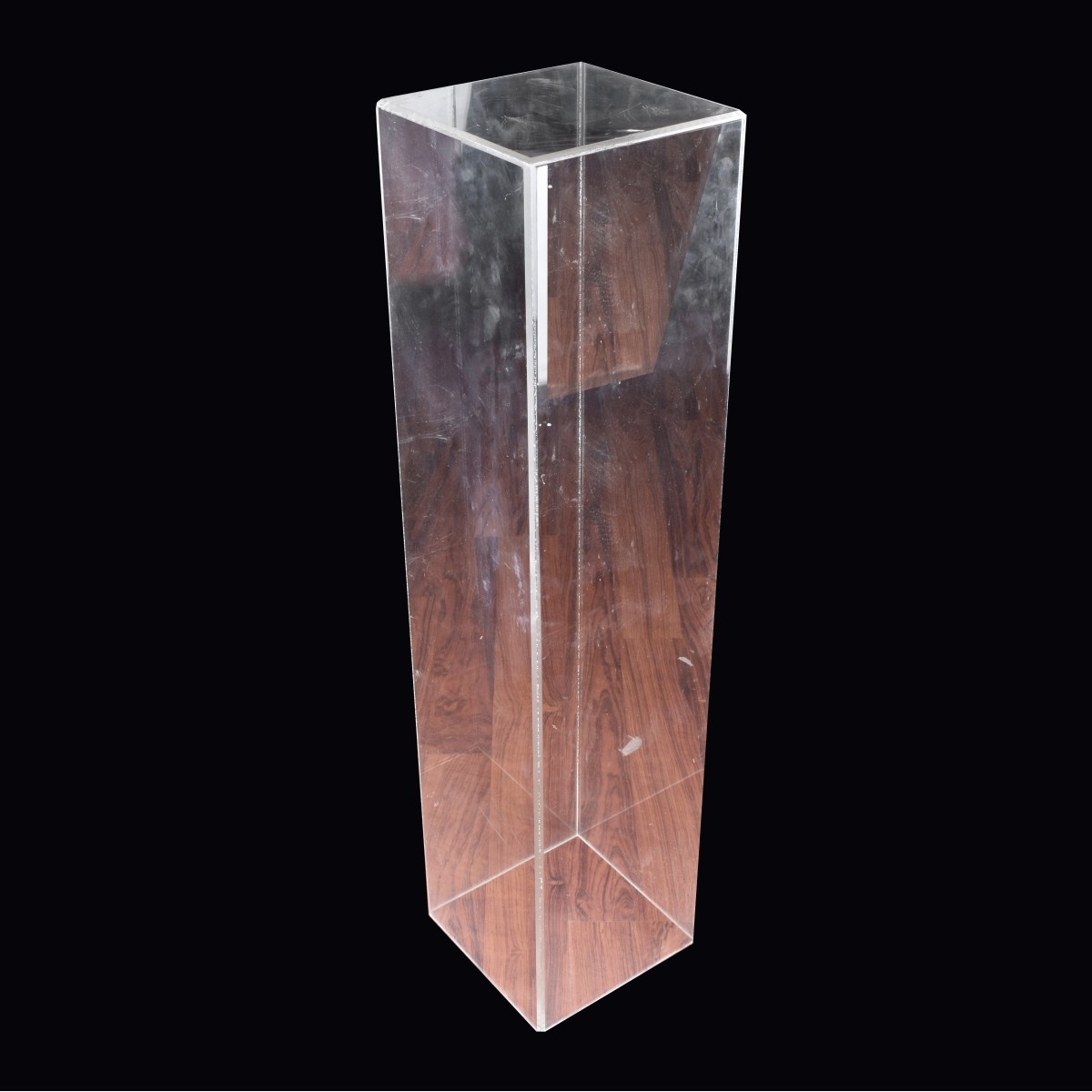 Clear Acrylic Square Pedestal. Measures 40" H x 9-1/4" W Condition: Good condition. Light scratching. Estimate: $50.00 - $100.00 Domestic Shipping: Third Party