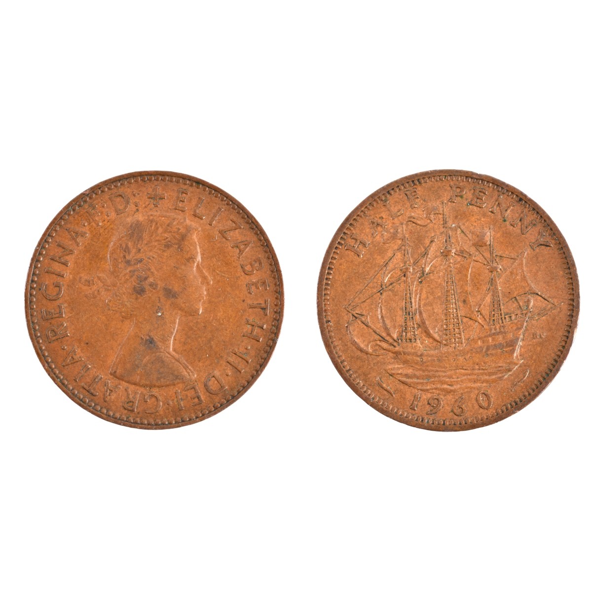 Lot of Forty One (41) Assorted United Kingdom Bronze Coins. Includes: (18) Elizabeth II half pennies (26 mm), (11) George VI half pennies (26 mm), (7) George V half pennies (26 )mm, (3) George VII half pennies (26 mm), and (2) Elizabeth II 2 new pence (25.9 mm). These Coins ARE NOT Professionally Graded, We DO NOT Grade Coins. Condition: Various condition, not graded Estimate: $50.00 - $150.00 Domestic Shipping: $38.00
