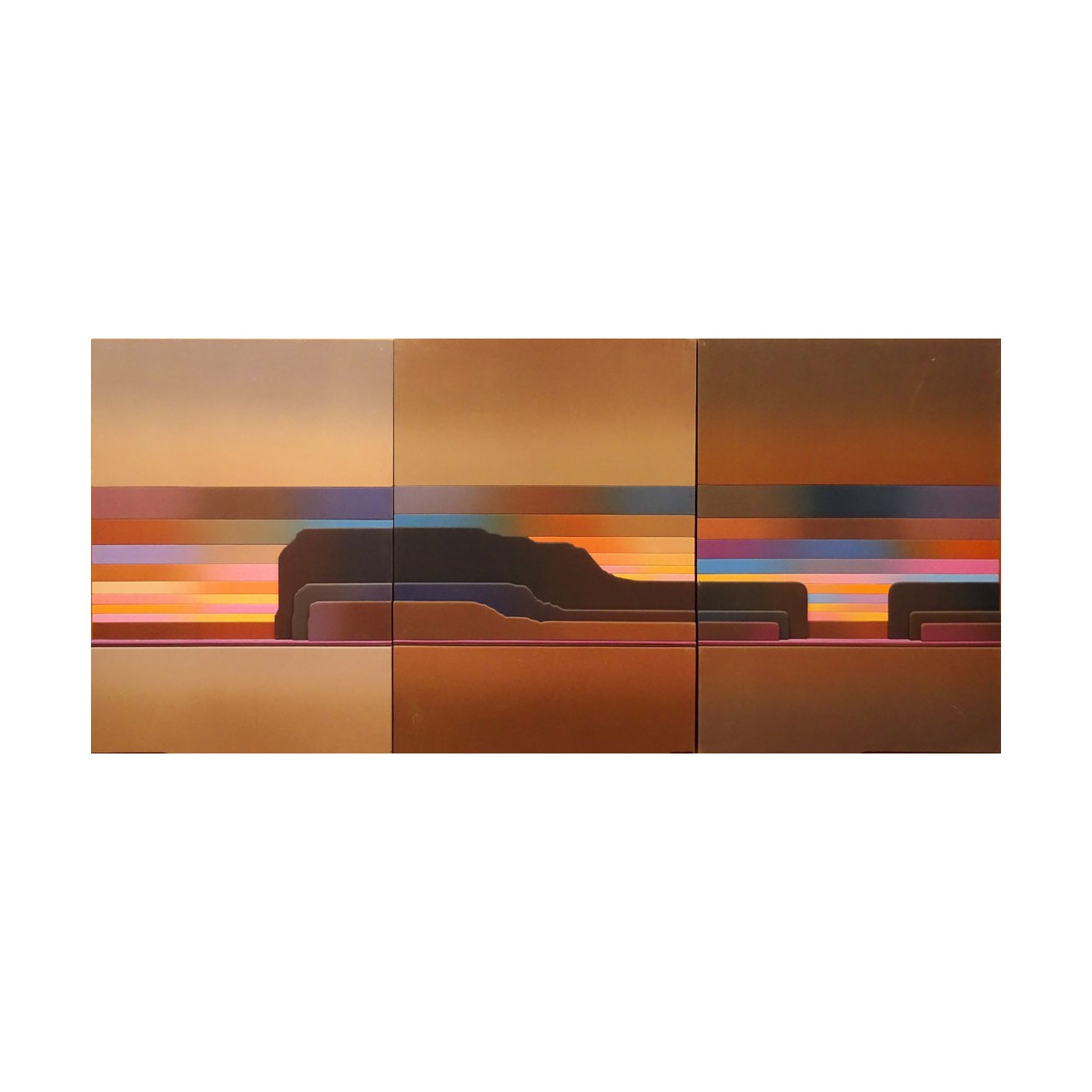 Rib Bloomfield, British (20th C) Retro 1970's Oil on Canvas on wooden relief Tryptic Painting. Signed En Verso Rib Bloomfield. Good Condition. Each Panel Measures 48 Inches Tall by 41 Inches Wide. Total Length 123 Inches. (estimate $50-$100) Third Party Shipping