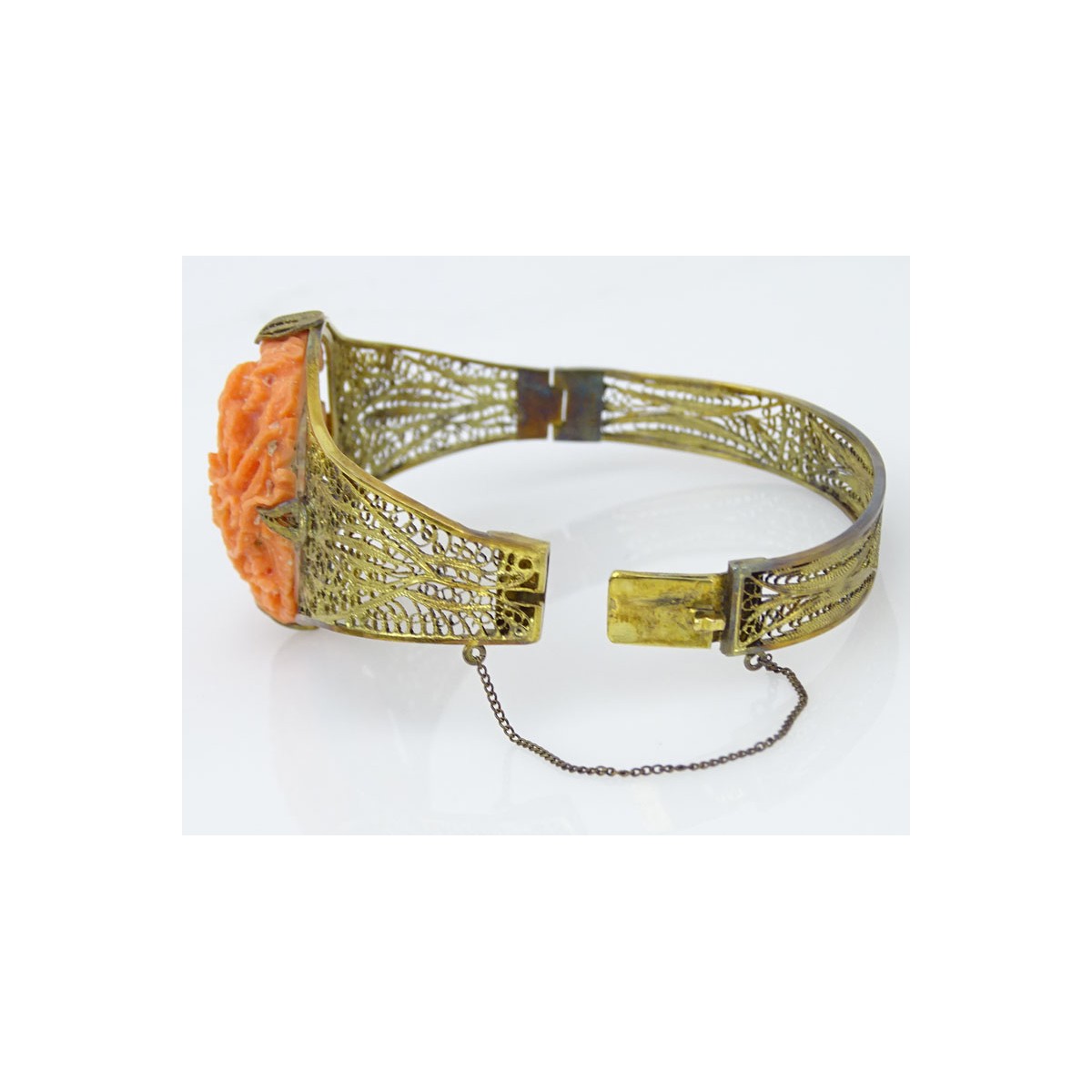 Antique Carved Red Coral and Silver Filigree Bangle Bracelet. Signed syx14K, Gold plated, Oxidation to silver, bracelet slightly out of round. Coral measures 1-1/4" H, 1-1/8" W; bracelet measures 1-3/8" W, 2-1/2" interior diameter. Approx. weight: 27.2 grams. (estimate $100-$200) Shipping $30.00