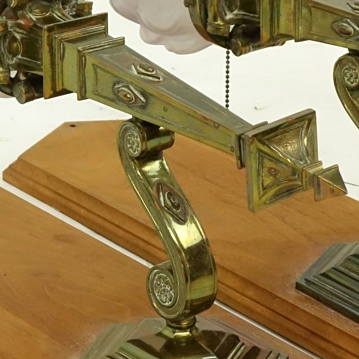 Pair of Bronze Wall Sconces with Frosted Glass Shade, Mounted on Wood Backing. Spotting and rubbing to surface. Measures 22-1/2" H x 7-1/4" W. (estimate $100-$200) Shipping: Third party.