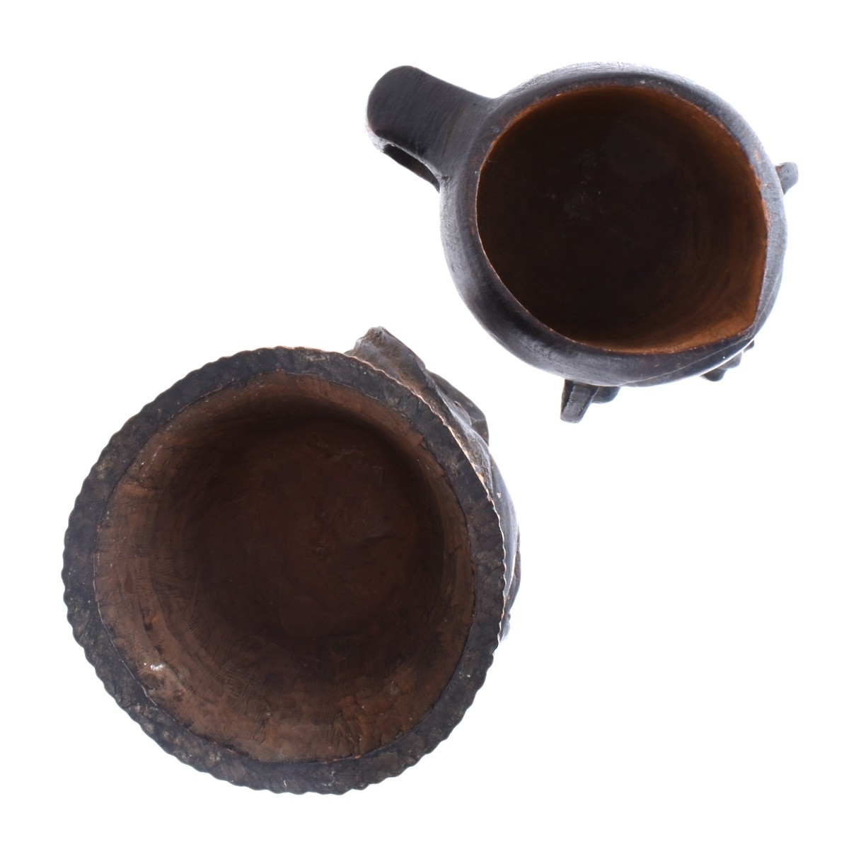 Three (3) African Wood Carvings. Standing African wood carvings cup on head 10-3/4" H, Carved mug with face 6" H x 6" W, and a carved Elephant. Condition: Good Condition, some use. Estimate: $50.00 - $150.00 Domestic Shipping: $42.00