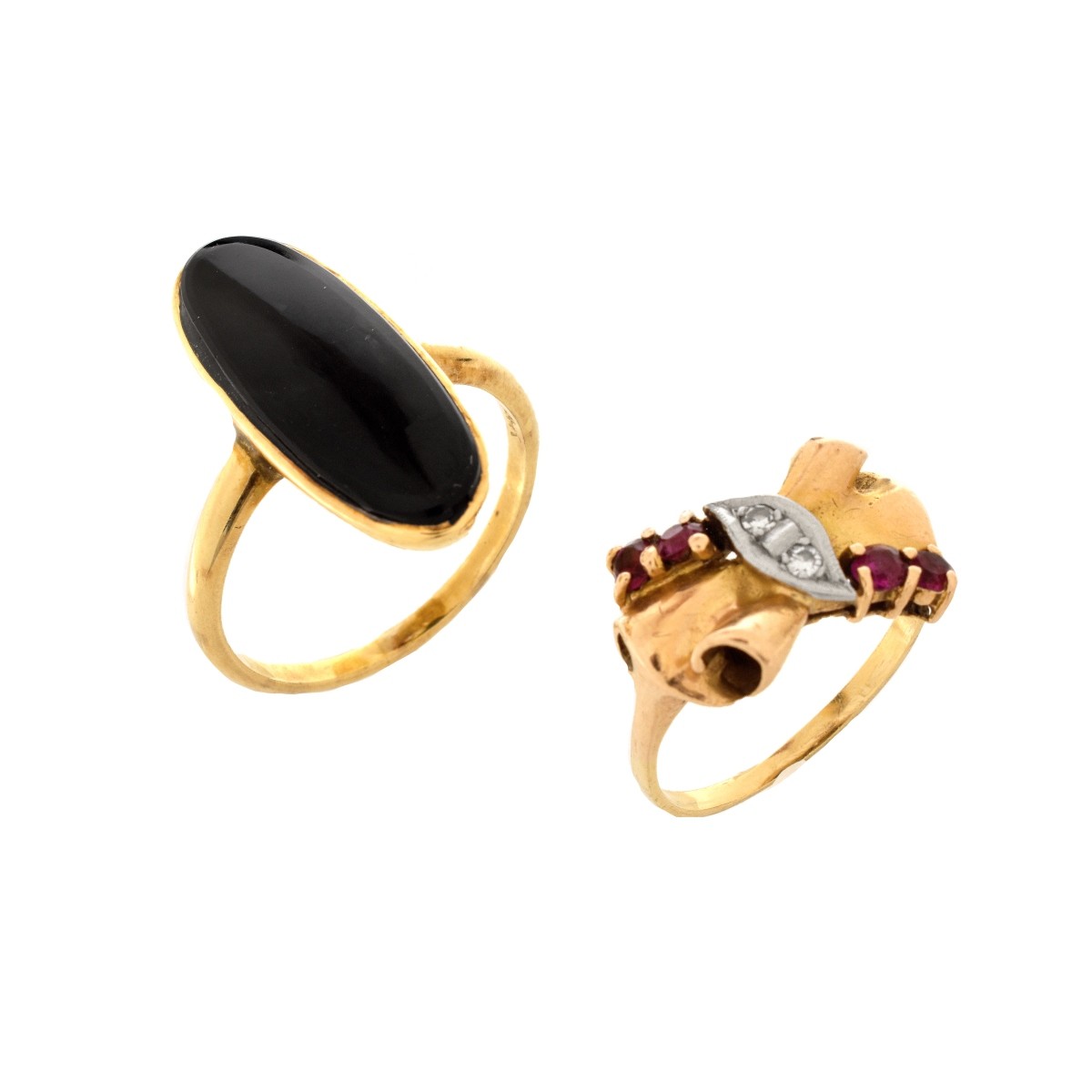 Two Vintage 14 Karat Yellow Gold Rings, One Set with Black Onyx, One Set with Small Diamonds and Rubies. Ring sizes 6-1/2, 9-1/2. Approx. weight: 8.0 grams. Condition: Good vintage condition. Ring with rubies slightly out of round. Estimate: $100.00 - $150.00 Domestic Shipping: $28.00