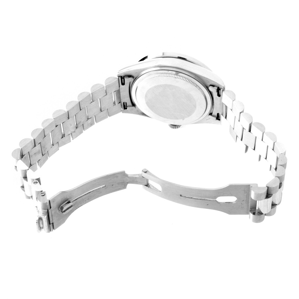 Man's GR Round Brilliant Cut Diamond, Sapphire and 18 Karat White Gold Rolex style Bracelet Watch with Automatic Movement. Diamonds F-G color, VS2-SI1 clarity. Case measures 36mm. Stamped 18K. Approx. weight: 134.7 grams. Condition: Slight surface wear / scratches from normal use. Running. Please note the gallery does not warranty the running condition of watches. Estimate: $3000.00 - $4000.00 Domestic Shipping: $30.00