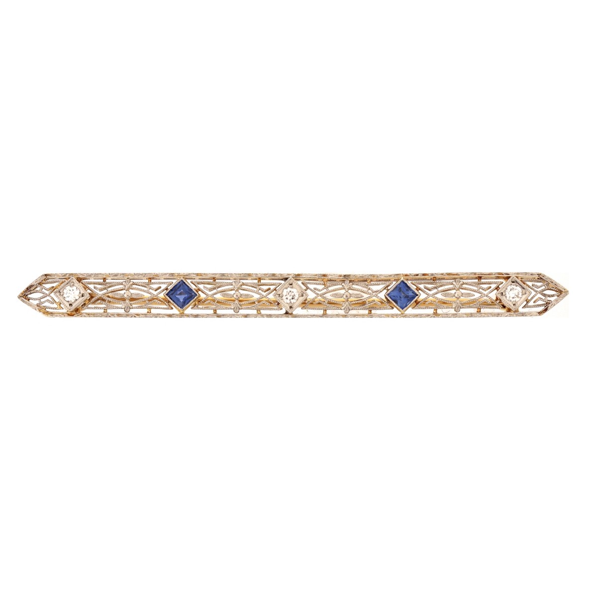 Art Deco Diamond, Sapphire, 14K Bar Pin
