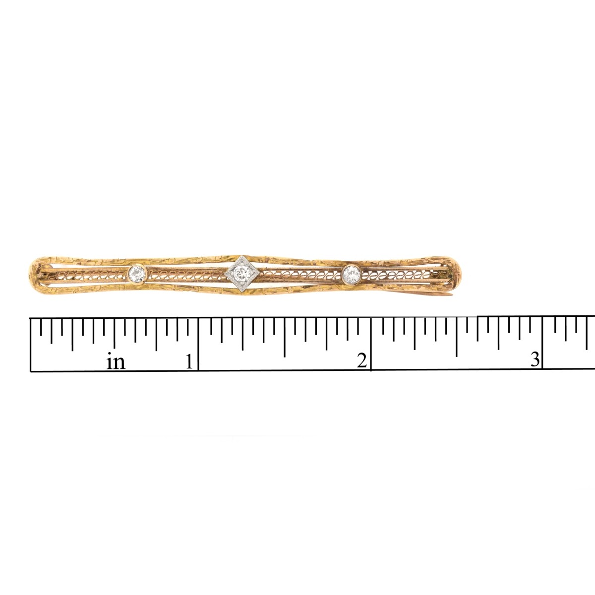 Art Deco Old European Cut Diamond and 10 Karat Yellow Gold Bar Pin. Stamped 10K. Measures 2-1/2" L, 1/4" W. Approx. weight: 3.5 grams. Condition: Good antique condition. Estimate: $100.00 - $150.00 Domestic Shipping: $28.00