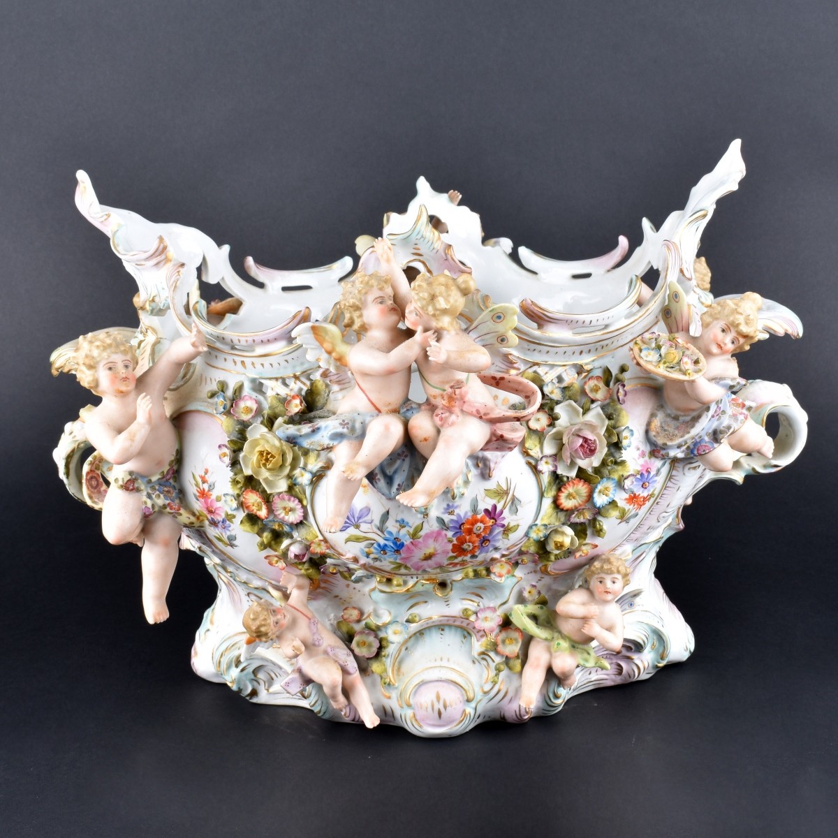 20th Century Sitzendorf Hand Painted Porcelain Cherub Figural Planter/Centerpiece. Signed on bottom side. High relief flowers and figures. Measures 10" H x 14-1/2" W. Condition: Chips and nicks, repairs otherwise good condition Estimate: $200.00 - $300.00 Domestic Shipping: Third party