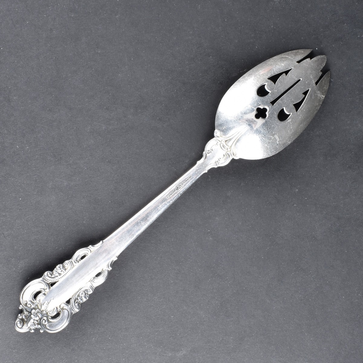 Wallace Grand Baroque Sterling Silver Flatware Set. No Monogram. Sixty one (61) Pieces consisting of 12 Dinner Knives Stainless Blades, 12 Dinner Forks 7-1/2", 11 Salad Forks, 11 Tea Spoons, 12 Cream Soup Spoons, 1 Pie and Cake Server Stainless Blade, 1 Pierced Serving Spoon, 1 Cold Meat Fork. Total Weight approx. 114.7 Troy oz with knives. Weight approx. 77.9 Troy Oz. Condition: Good condition. Some scratching. Needs a cleaning. Flatware Box not Included. Estimate: $1000.00 - $2000.00 Domestic Shipping: $110.00