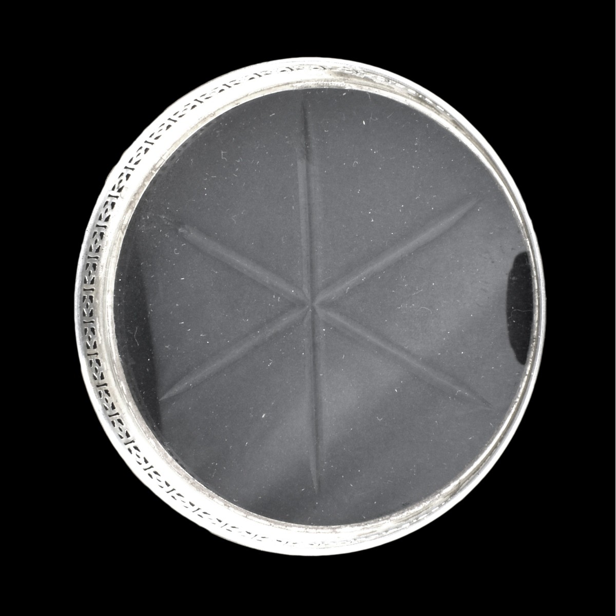 Four (4) Pieces of Sterling Silver Tableware. Birks Sugar Shaker 3.95 toz.. 6-1/2" H. Webster 8pc. pierced coaster set with cut crystal 2-1/2" H x 3-1/4" D, Russian serving spoon hallmarked 1.94 toz, 8-1/2" L. Cheese hollow handle, stainless blade 6-1/2" L. Approx. Measure. All marked sterling. Condition: Good condition. Bumps in center of spoon. Light bump to shaker. Estimate: $50.00 - $100.00 Domestic Shipping: $52.00