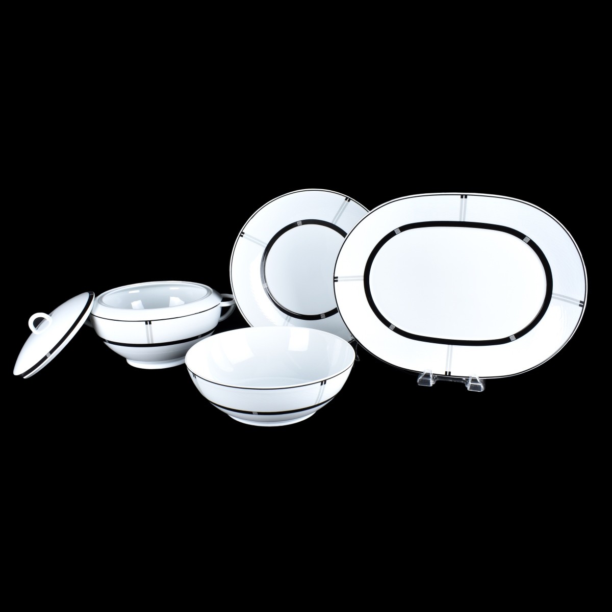 Ninty Five (95) Limoges China. Eighty Nine (89) Bernardaud "Wiener" Dinner set 12 Dinner 10-1/2 D. 12 Salad, 12 Bread and Butter, 11 Coffee cups, 12 Saucers, 12 Cream Soup, 12 Saucers, 15" Oval Platter, 11-5/8" Chop Plate, 11-1/2" Platter, 9-7/8" Bowl, Covered Tureen 9-7/8 Handle to Handle x 7 H along with Six (6) Deshoulieres Canape Plate Roaring Twenties. Both marked appropriately to back. Condition: Good condition.1 Wiener salad plate and coffee cup chip to edge. 1 Canape Chip to edge. Estimate: $400.00 - $600.00 Domestic Shipping: Third Party