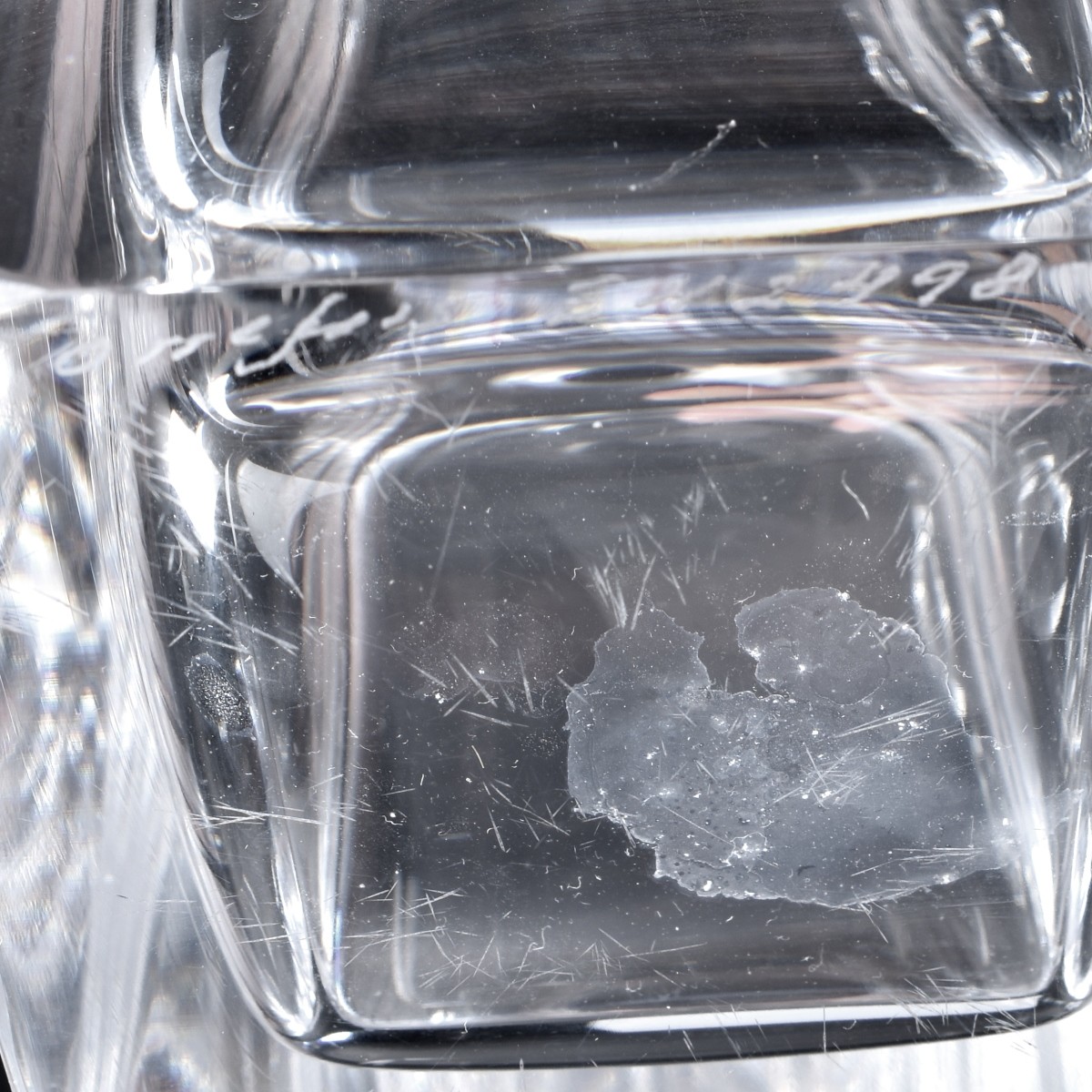 Four Crystal Decanter. One decanter marked Orrefors En2498 12" H x 3" W. Two Liquor (2) with Lions Etched and Two metal tags Vodka, Whisky 8-1/2" H x 3-3/4" W. One Tumble up bedside carafe, clear glass with flower scene, metal rim to hold glass. 8" H x 4-1/2" W Condition: Good condition. Some light scratching to bottoms, two are a bit cloudy. Estimate: $100.00 - $200.00 Domestic Shipping: $92.00