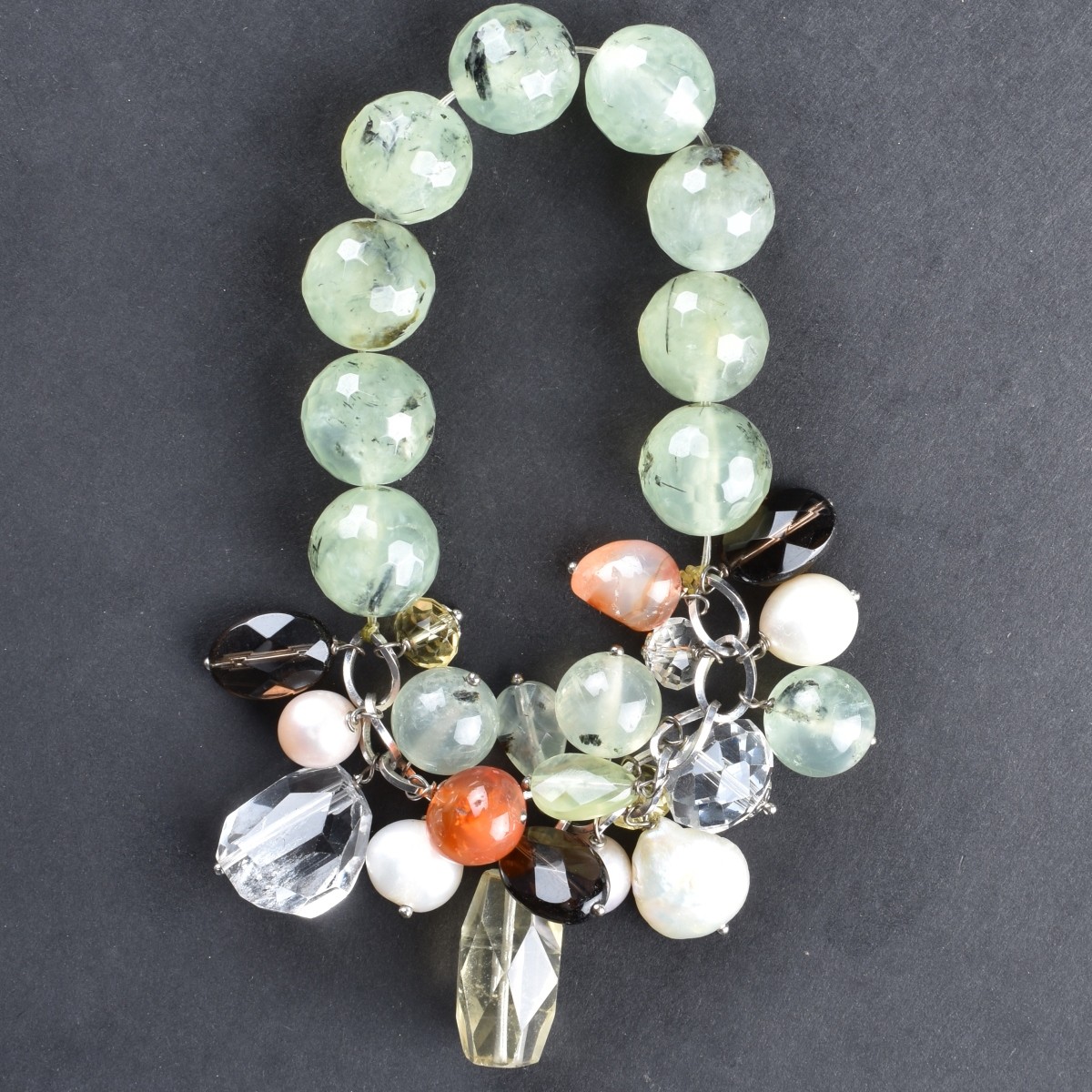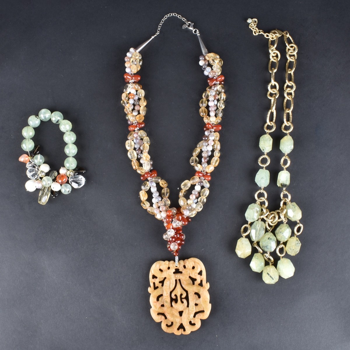 Three Pieces Agate Designer Costume Jewelry. A green Necklace and matching Bracelet and a Carnelian necklace with carved agate pendant. Measures 15" L Condition: Good condition. Bracelet needs a clasp Estimate: $50.00 - $150.00 Domestic Shipping: $32.00