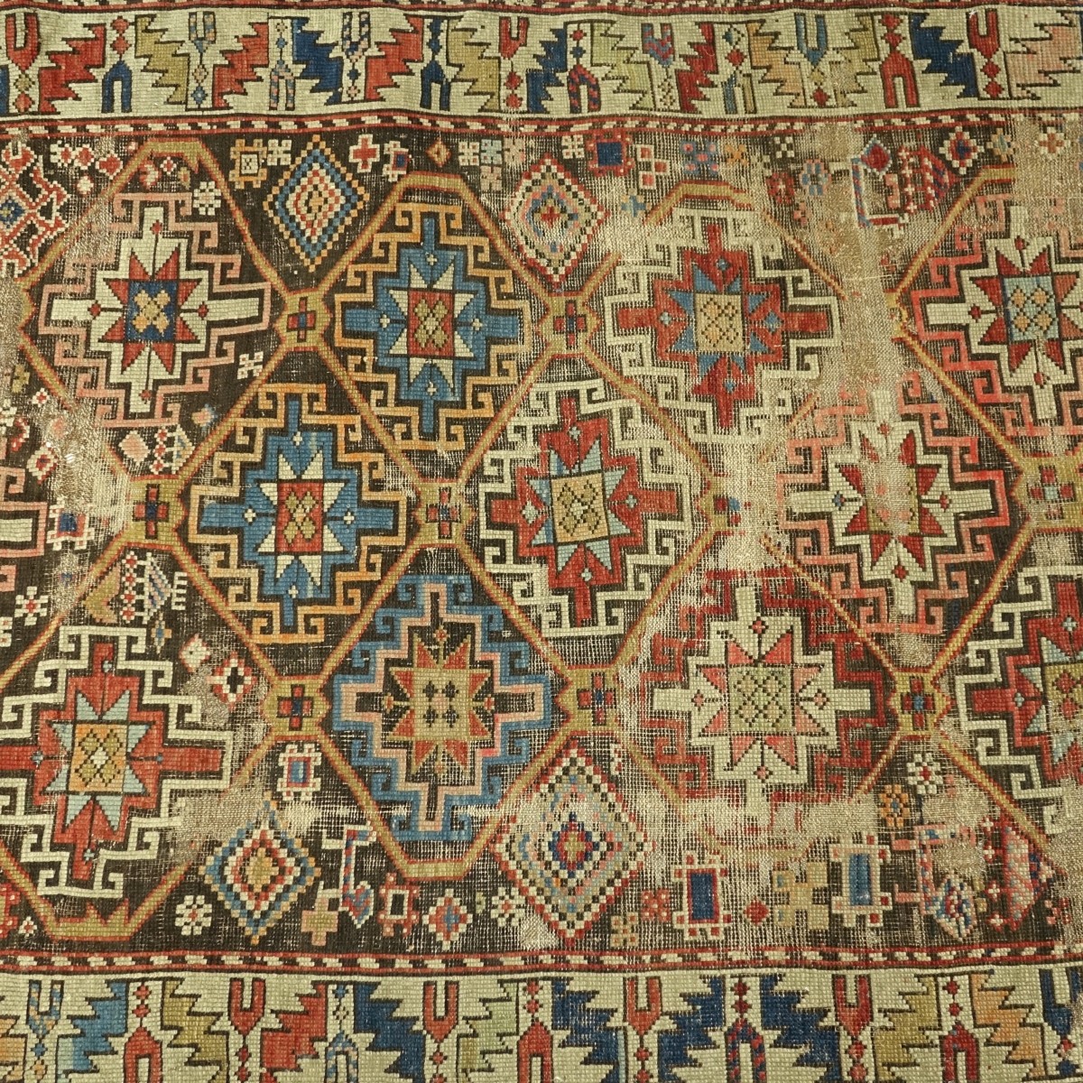 Antique Persian Caucasian Shirvan Tribal Rug. Intricate patterns on borders with scattered medallions. Measures 59-1/2" H x 39-1/2" W. Condition: Loss to fringes, worn spots Estimate: $100.00 - $200.00 Domestic Shipping: $68.00