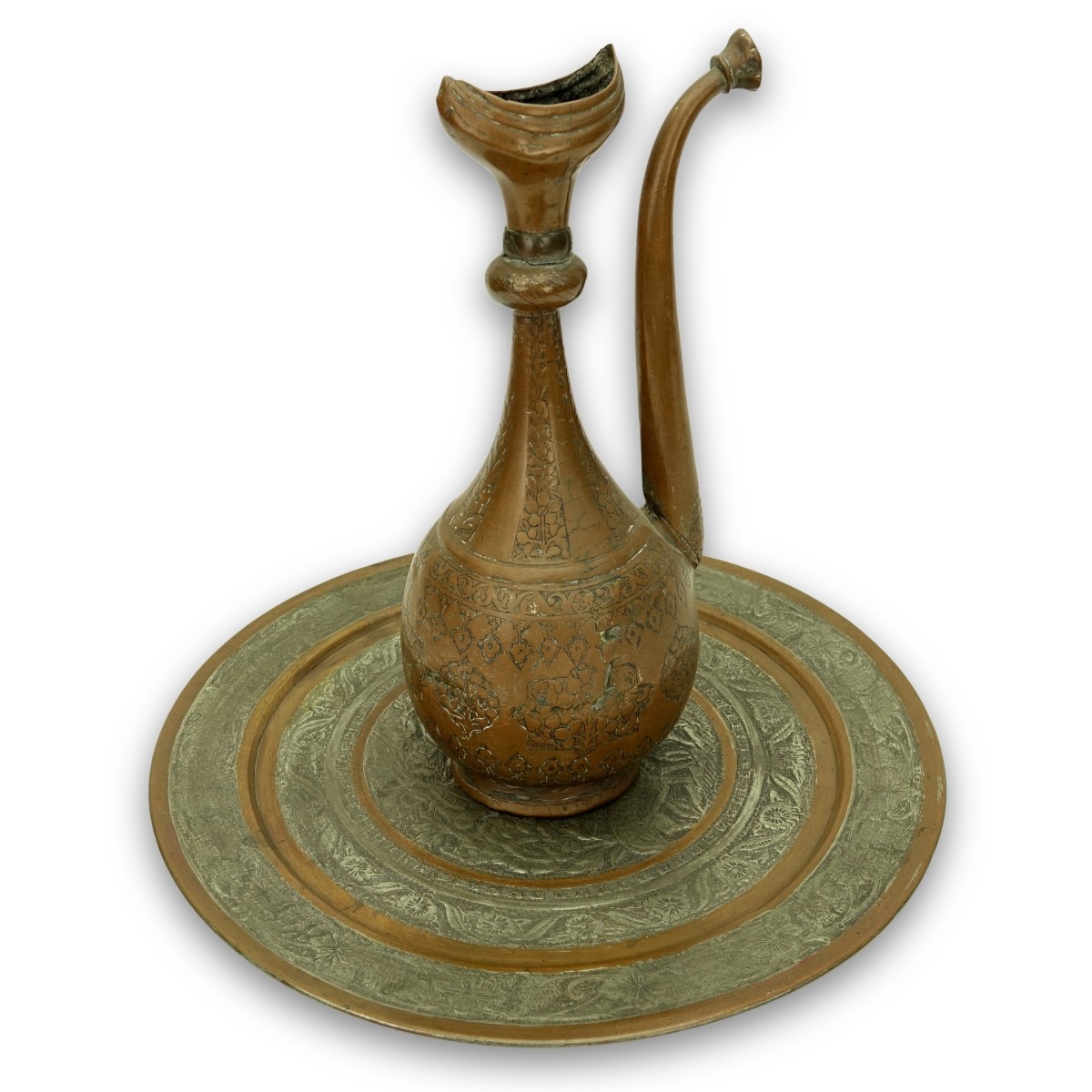 Grouping of Two (2) Possibly Early Copper Islamic Tableware. Includes a Hand Hammered pitcher measuring 16" H and round tray measuring 15-3/4" dia. Condition: Typical dings and wear otherwise good condition Estimate: $200.00 - $400.00 Domestic Shipping: Third party
