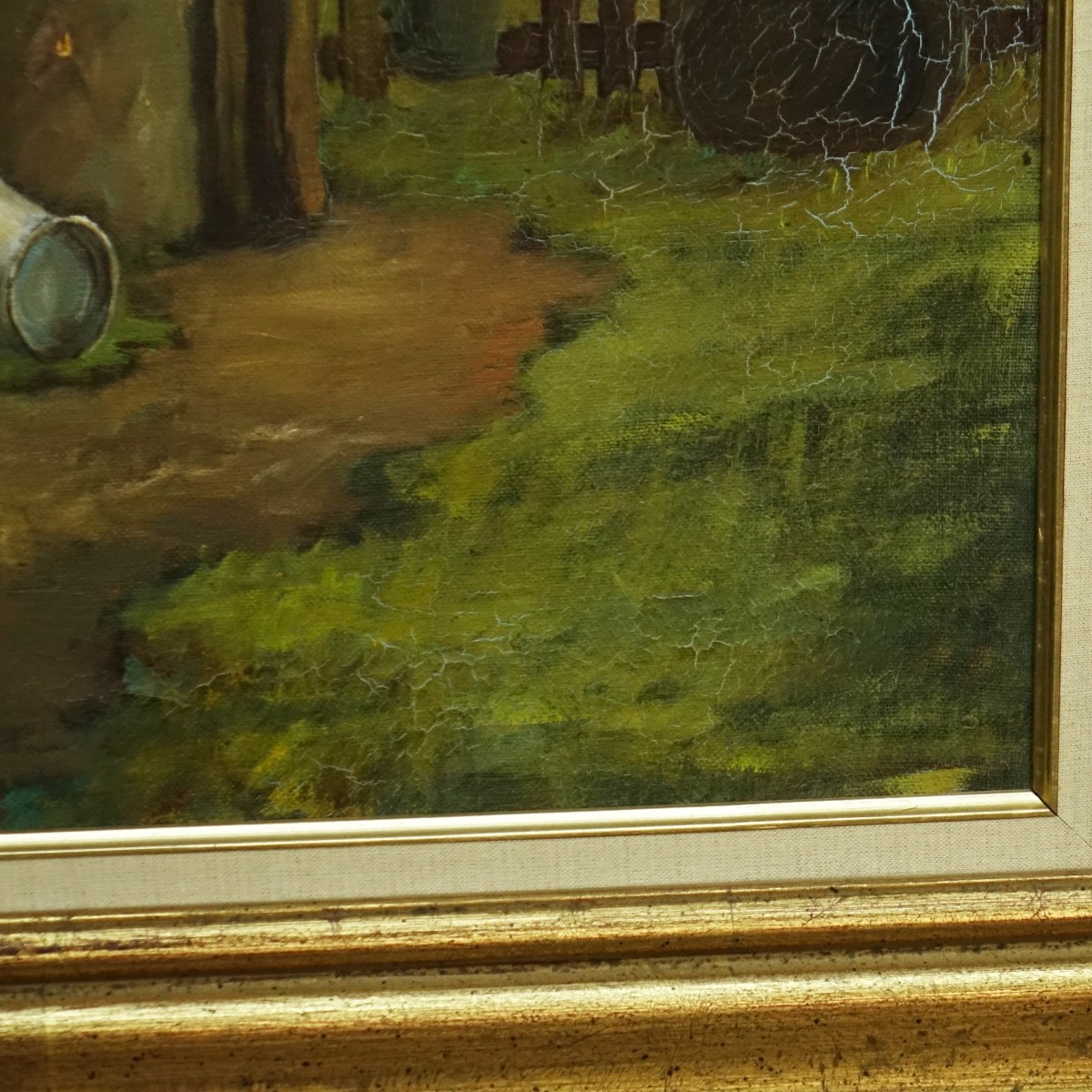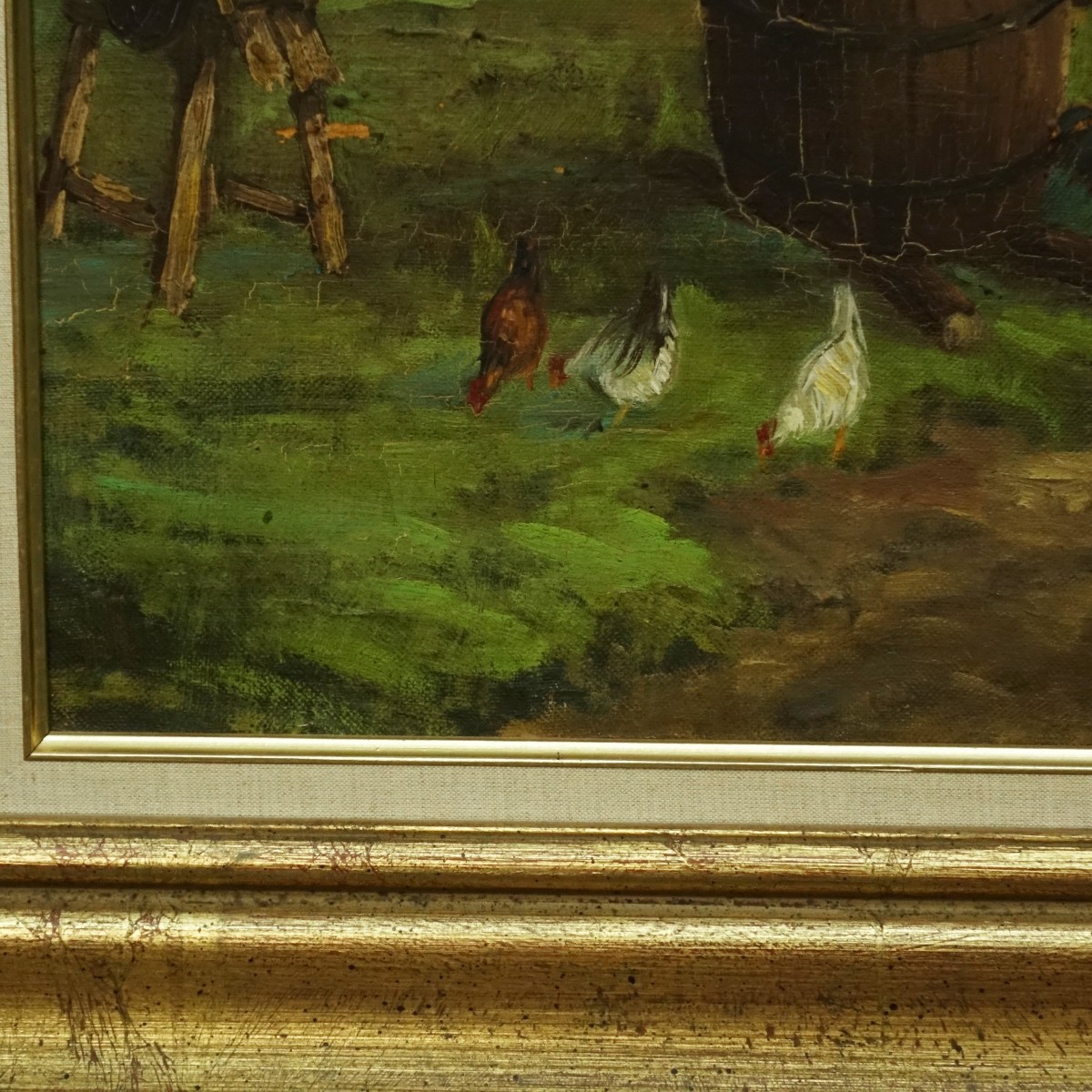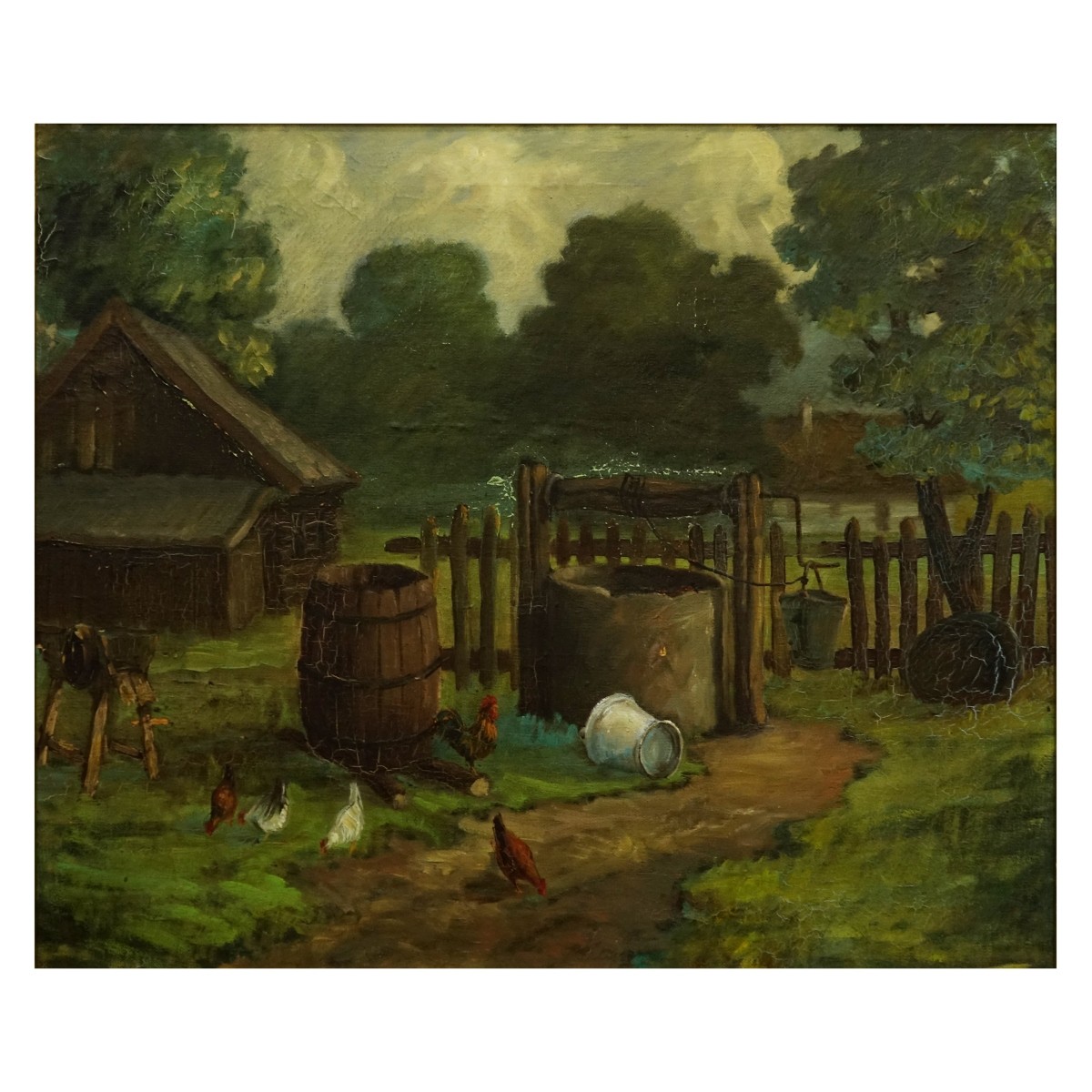19th - 20th Century Polish School Oil on Canvas Farm House with Chickens. Unsigned. Measures 19-3/4" H x 23-5/8" W Frame 26-7/8" H x 30-3/4" W Condition: Good condition. Craquelure throughout the painting. Some scratching to frame. Estimate: $50.00 - $100.00 Domestic Shipping: $145.00
