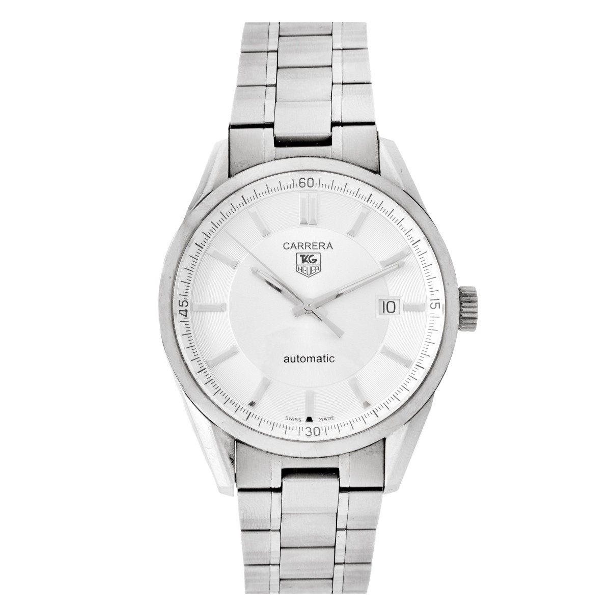 Man's Tag Heuer Carrera Stainless Steel Bracelet Watch with Automatic Movement, Outer Box and Extra Bracelet Links. Case measures 39mm. Condition: Surface wear and scratches from normal use. Running. Please note the gallery does not warranty the running condition of watches. Estimate: $500.00 - $700.00 Domestic Shipping: $34.00