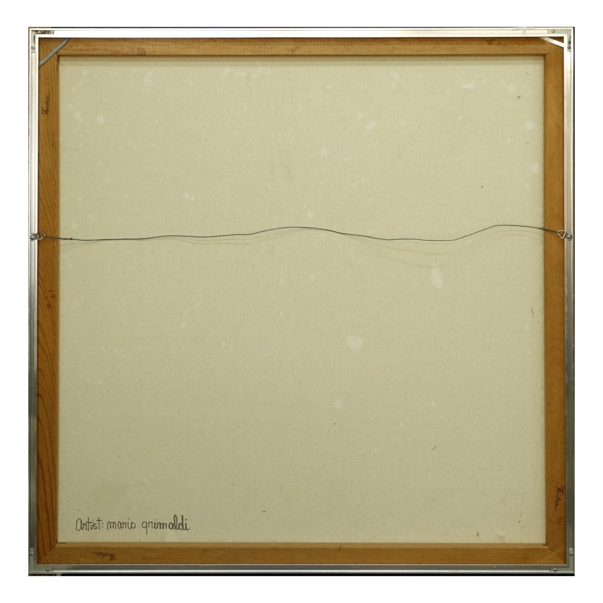 Mario Grimaldi, American (1927 - 1997) Acrylic on Canvas "Moonscape and Construct" Signed Lower Left. Inscribed en verso. Measures 35" H x 35" W, frame measures 36-1/4" H x 36-1/4" W. Condition: Good condition Estimate: $200.00 - $400.00 Domestic Shipping: Third party