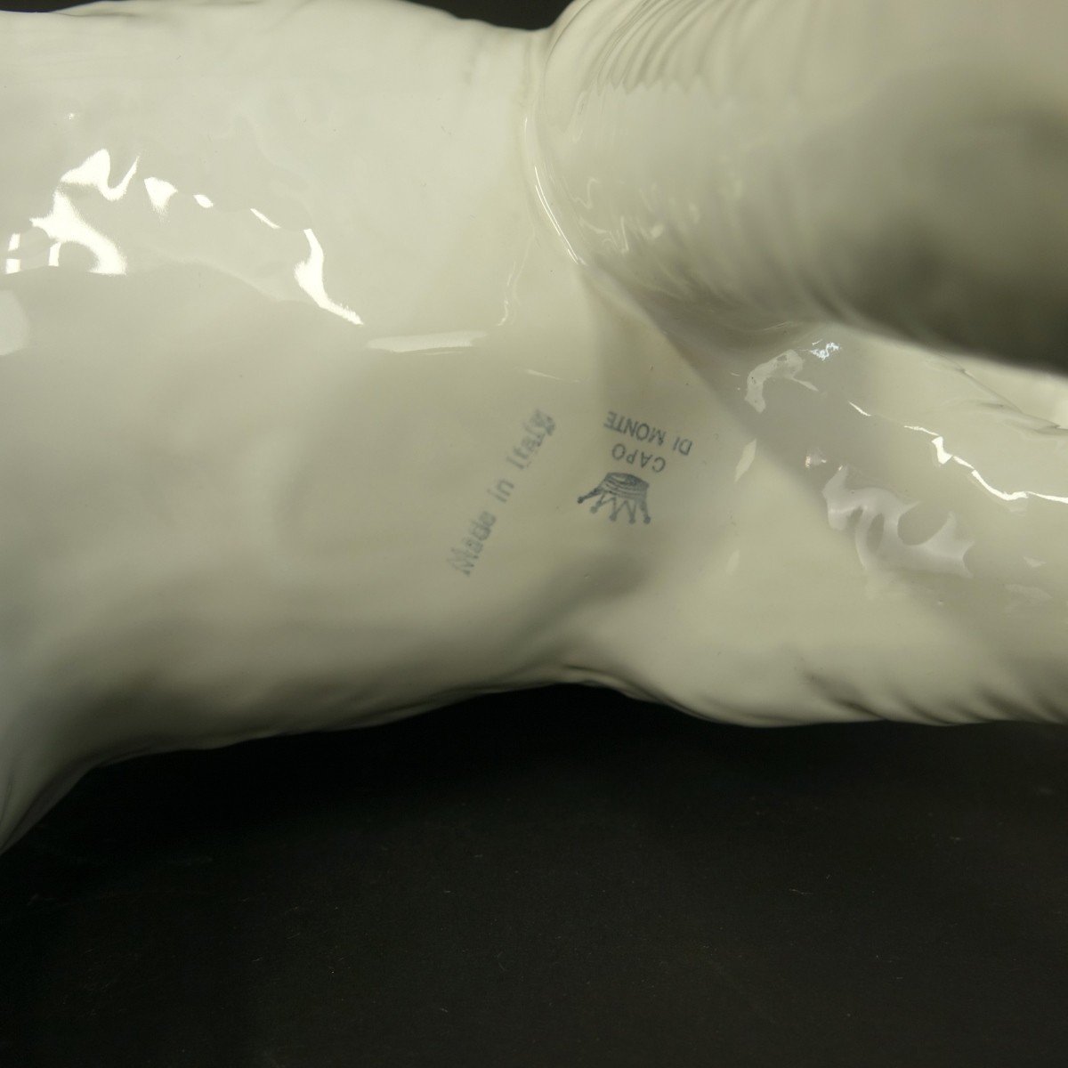 Vintage Three (3) Italian White Pottery Elephants. One elephant with baby, one trumpeting, one walking. Signed with a 5 pointed crown Capo Di Monte under it and Made in Italy. Largest measures approx. 14-1/2" H x 19" L x 7" W Condition: Good Condition. No damage scuffing to bottom of feet. Estimate: $50.00 - $100.00 Domestic Shipping: Third Party